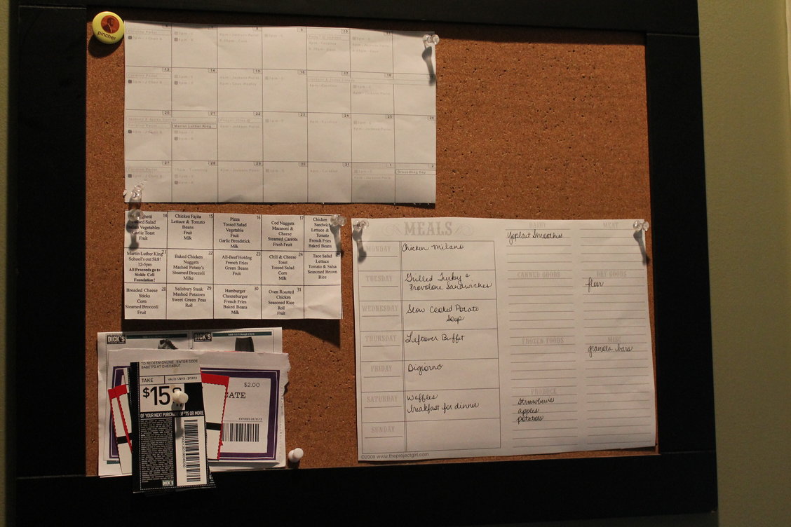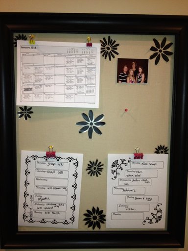 My friend Staci had some great suggestions on creating a “command” center to handle weekly schedules, menu planning and more. I asked her to send over a picture of hers (so I’d know where to start!), and this is what she made using an open frame from Hobby Lobby, piece of cardboard, and plain fabric. She cut the cardboard to fit into the opening of the frame, covered it with tan muslin fabric, and decorated it with wall decals.
