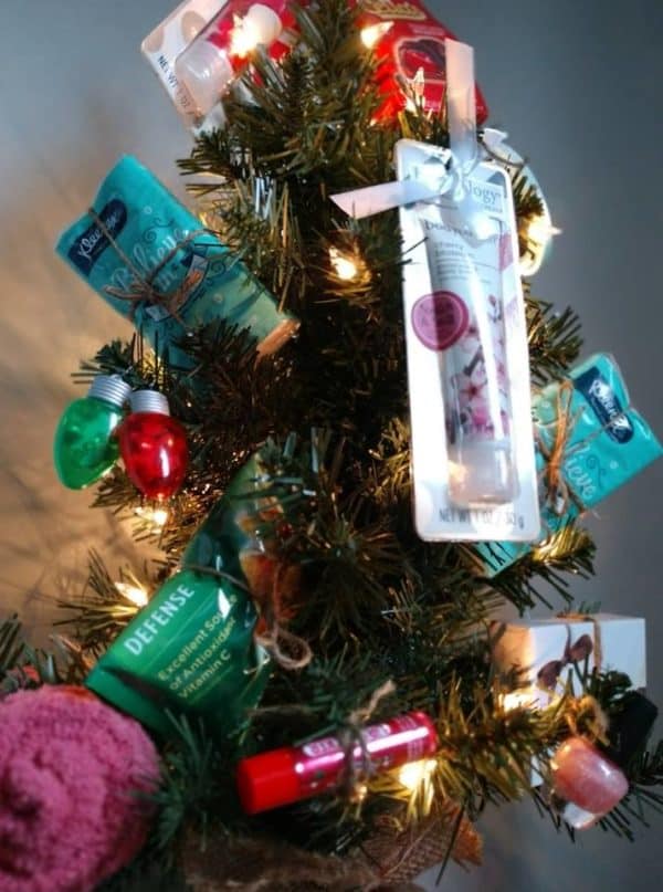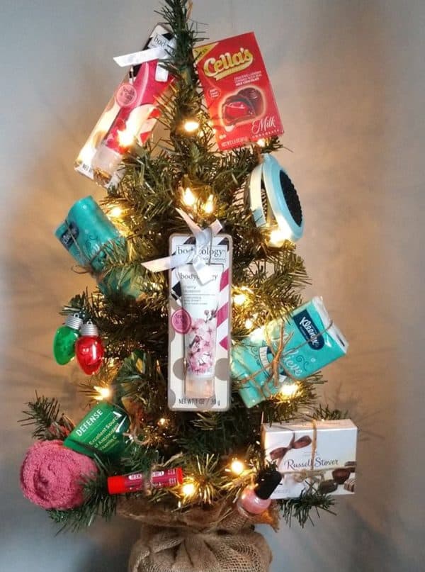 If you have an older relative or friend in a nursing home – a sweet little tree will be a cheerful addition to their room. Fill it with items they can use like fuzzy socks, lotion, lip balm, cough drops, nail polish, candies and tissues.