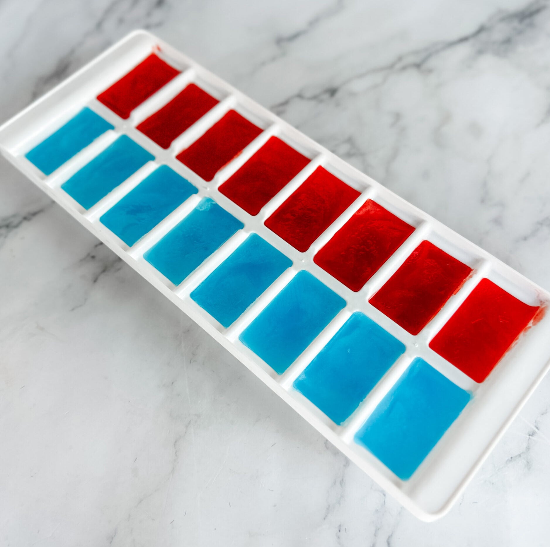 Start by filling ice cube trays with the red and blue Gatorade. You’ll want to do this with enough time that the ice cubes are frozen solid, so make sure to give yourself a couple days before the holiday for this step.