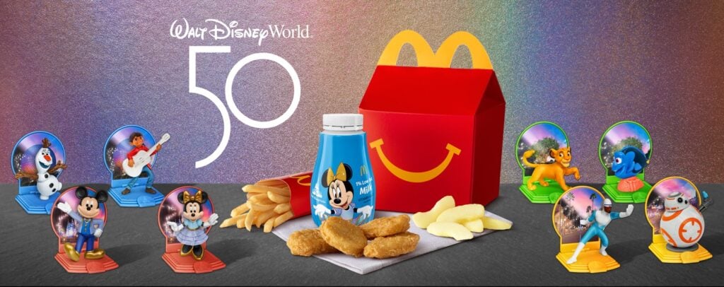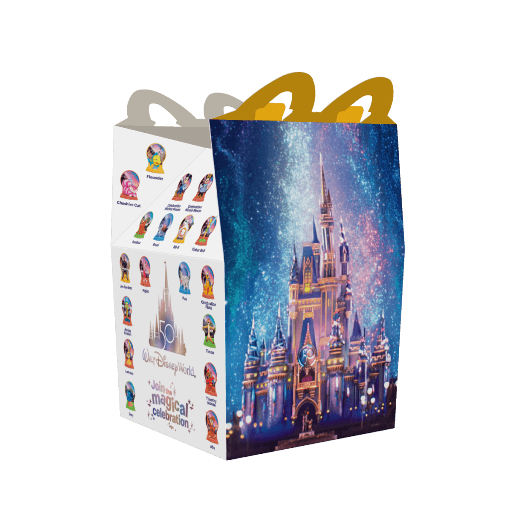 To celebrate Walt Disney World’s 50th Anniversary, they’ve partnered with McDonald’s for a new Happy Meal toy release. For a limited time at participating restaurants around the country, Happy Meals will include never-before-seen Disney figurines of fan favorites from over the years. A few will eve be wearing 50th Anniversary Celebration “EARidescent” fashions.