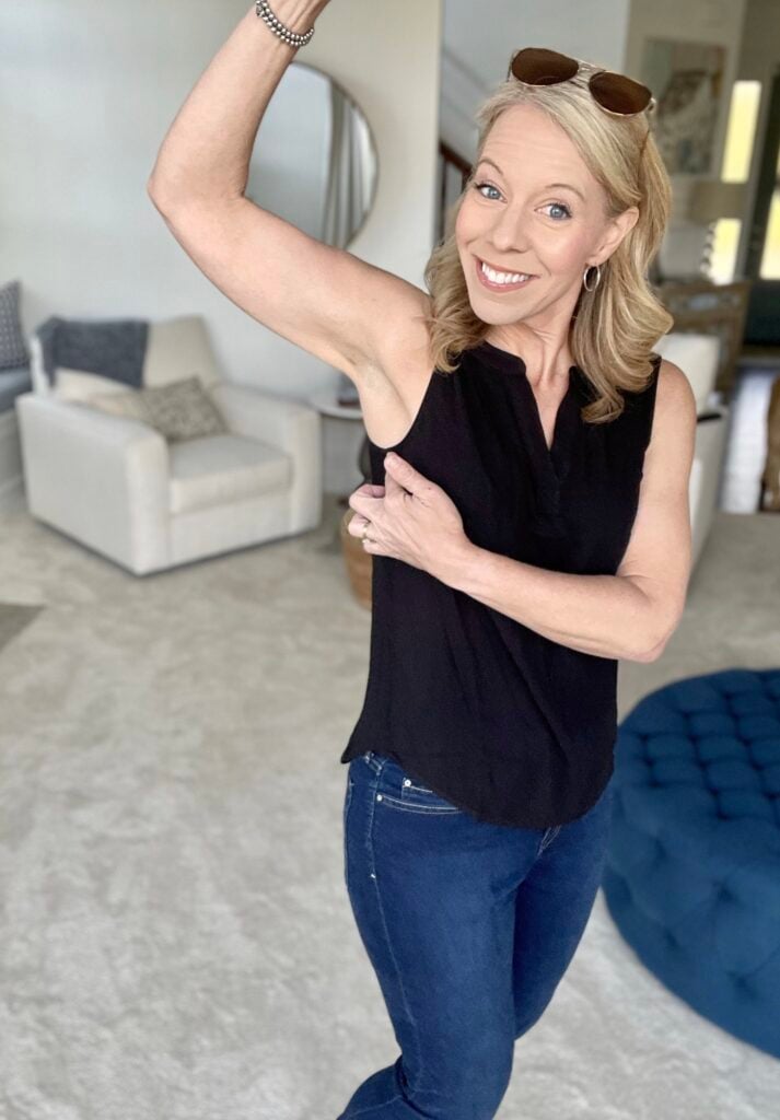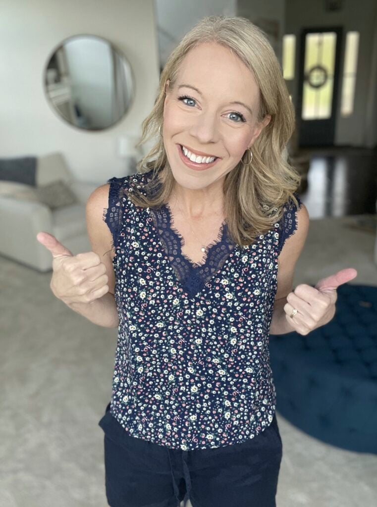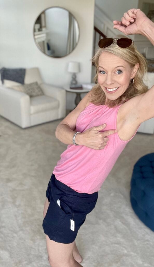 This Amazon Sleeveless Pleated Tank is great because it covers your bra line (LOVE THAT!) and drapes well. This one has a ton of cute patterns available too, and might just be the “magic top” of summertime! Laurie’s wearing a small in Coral Pink and it fits true to size.