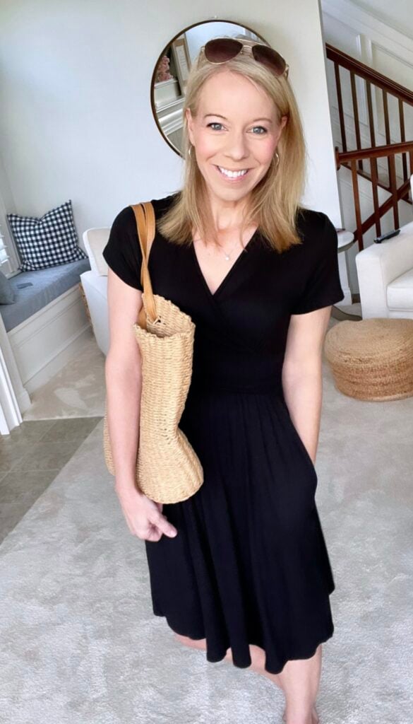 It’s a little shorter than the other black dress I’m wearing above, but would be great for a running around town dress, dress it up for church, or throw it on over a swimsuit. Super versatile!