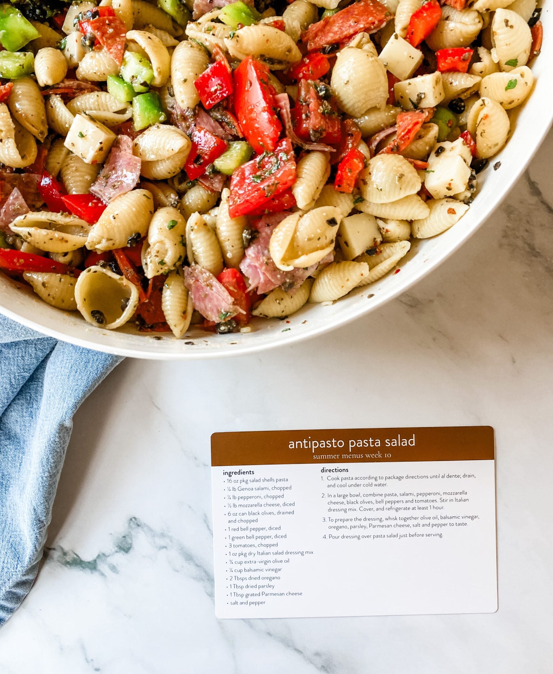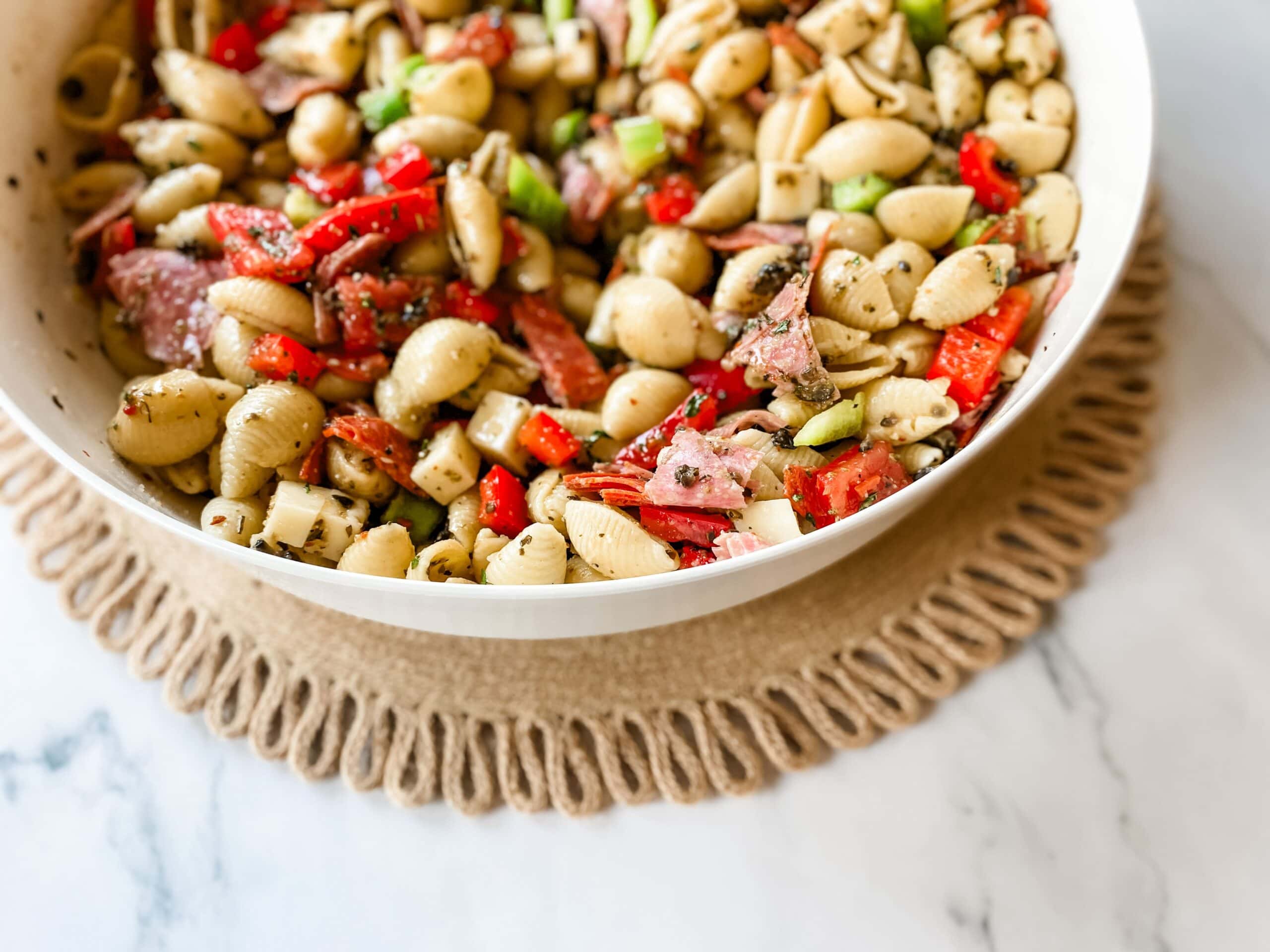 This antipasto pasta salad is a delicious combination of pasta, meat, and cheese plus a yummy homemade dressing. It’s perfect for a picnic!