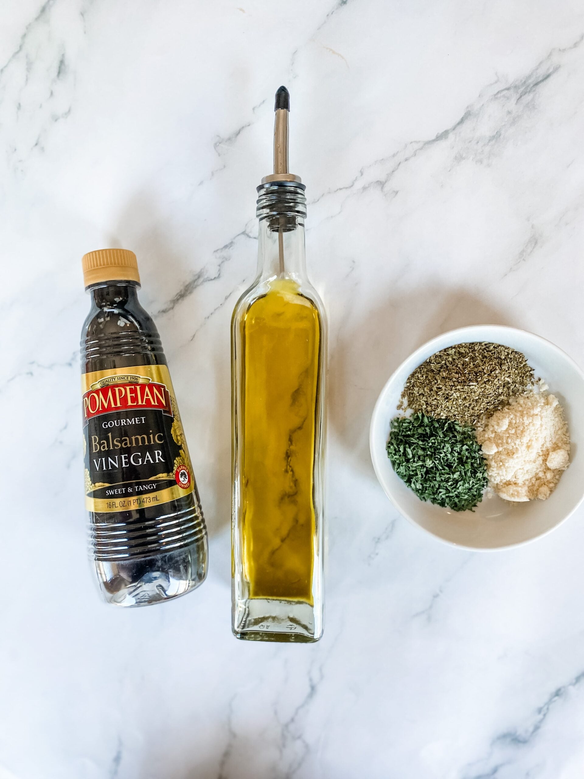 - To prepare the dressing, whisk together olive oil, balsamic vinegar, oregano, parsley, Parmesean cheese, and salt and pepper to taste.