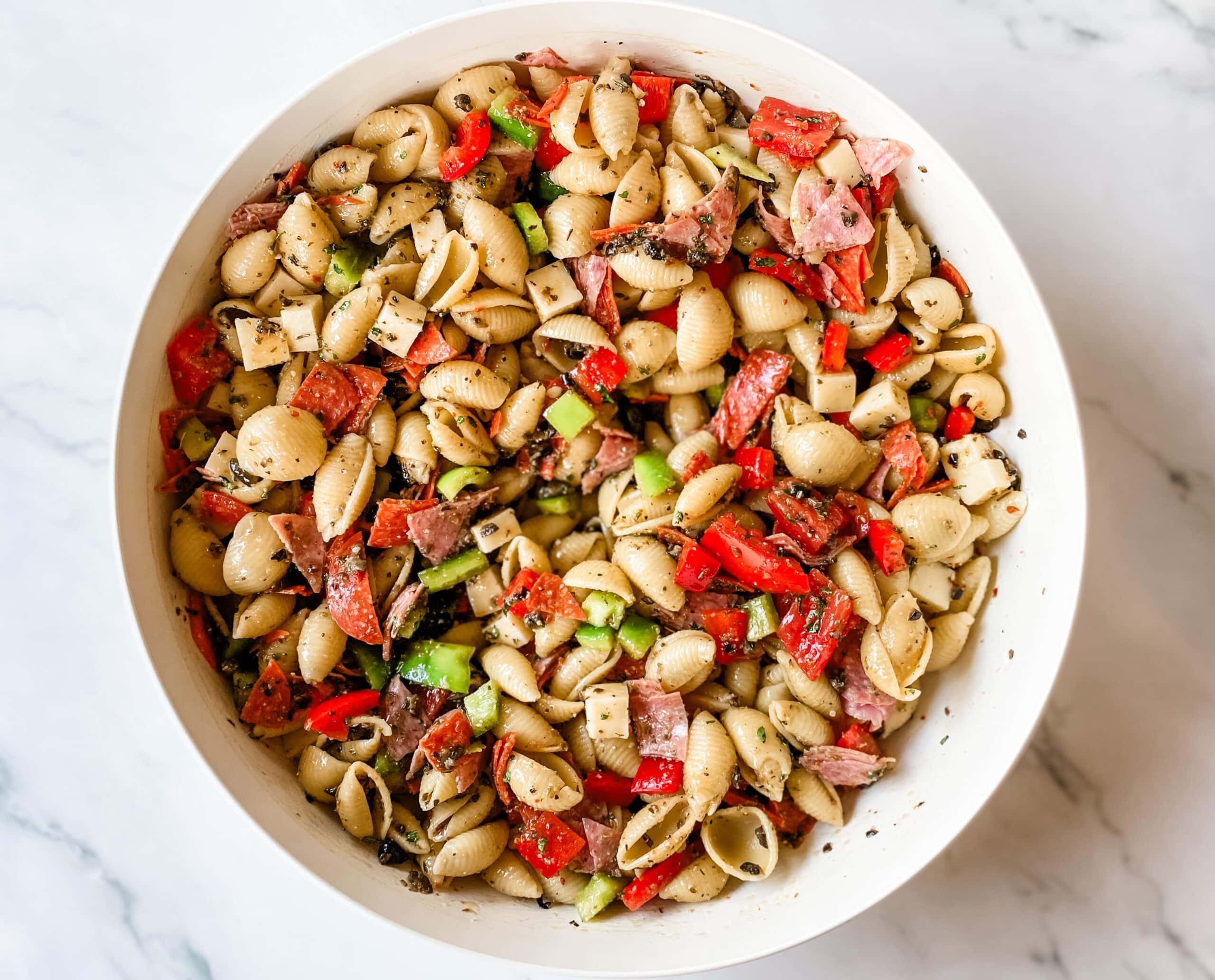 Grab a large bowl and combine your cooled pasta, meats, cheeses, and vegetables. Stir in the Italian dressing mix. Cover and refrigerate for at least 1 hour to marinade the flavors together.