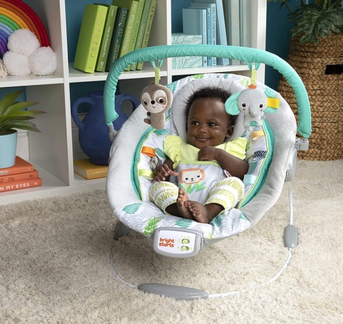 A bouncy seat can prop baby up and let them entertain themselves as they bounce gently – there is also a vibration setting to help soothe them.