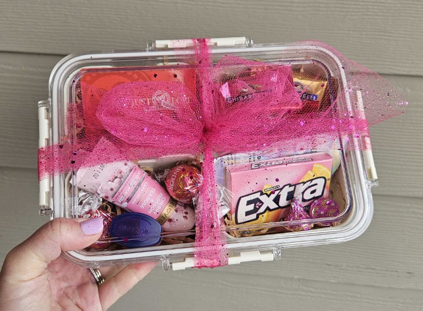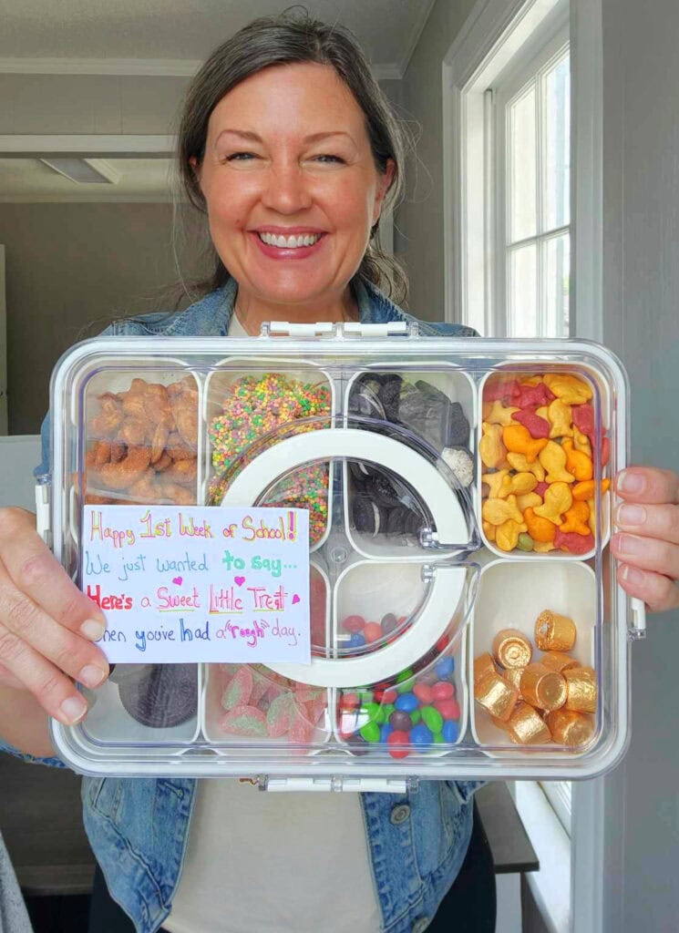 I got mY DIL things that won’t get stale if they sit in the box for a few days – but I could’ve filled it with cheese, meats, yogurts, berries, etc too, because she DOES have a classroom fridge. If I could’ve fit a Dr. Pepper into every little tray, that would’ve been the best of all ideas haha – she really loves her Dr. P 🙂