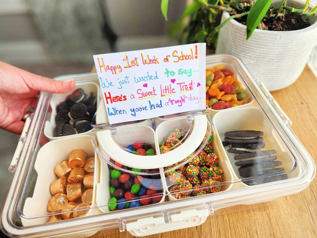 Jamie here! My daughter-in-law starts her first week of teaching in her very own classroom in a few days, and I wanted to put something cute together for her first day. I know she loves a “sweet little treat”, so I ordered this Divided Serving Tray (Under $10 right now!) and grabbed some of her favorite treats to fill it up. I wrote this little note to go with it 🙂