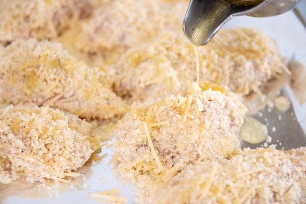 This recipe also uses one of the easiest marinades ever – ranch dressing! You can use any pre-made ranch dressing as well. Then just dip into the breadcrumbs mixture.