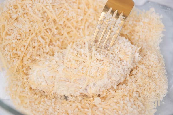 - Combine bread crumbs, Parmesan, garlic powder and a sprinkle of salt and pepper on a plate. Cut chicken into tenders, if desired.