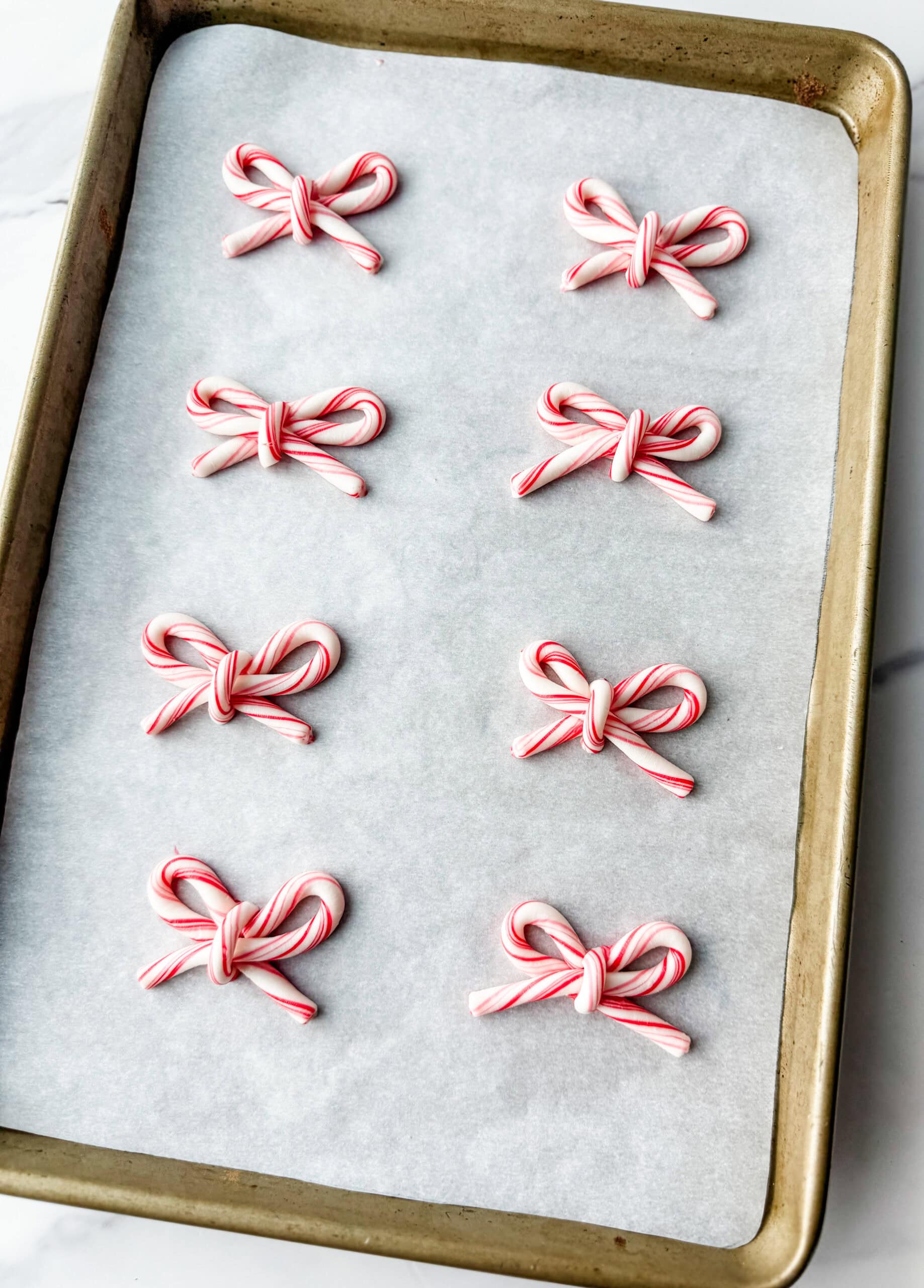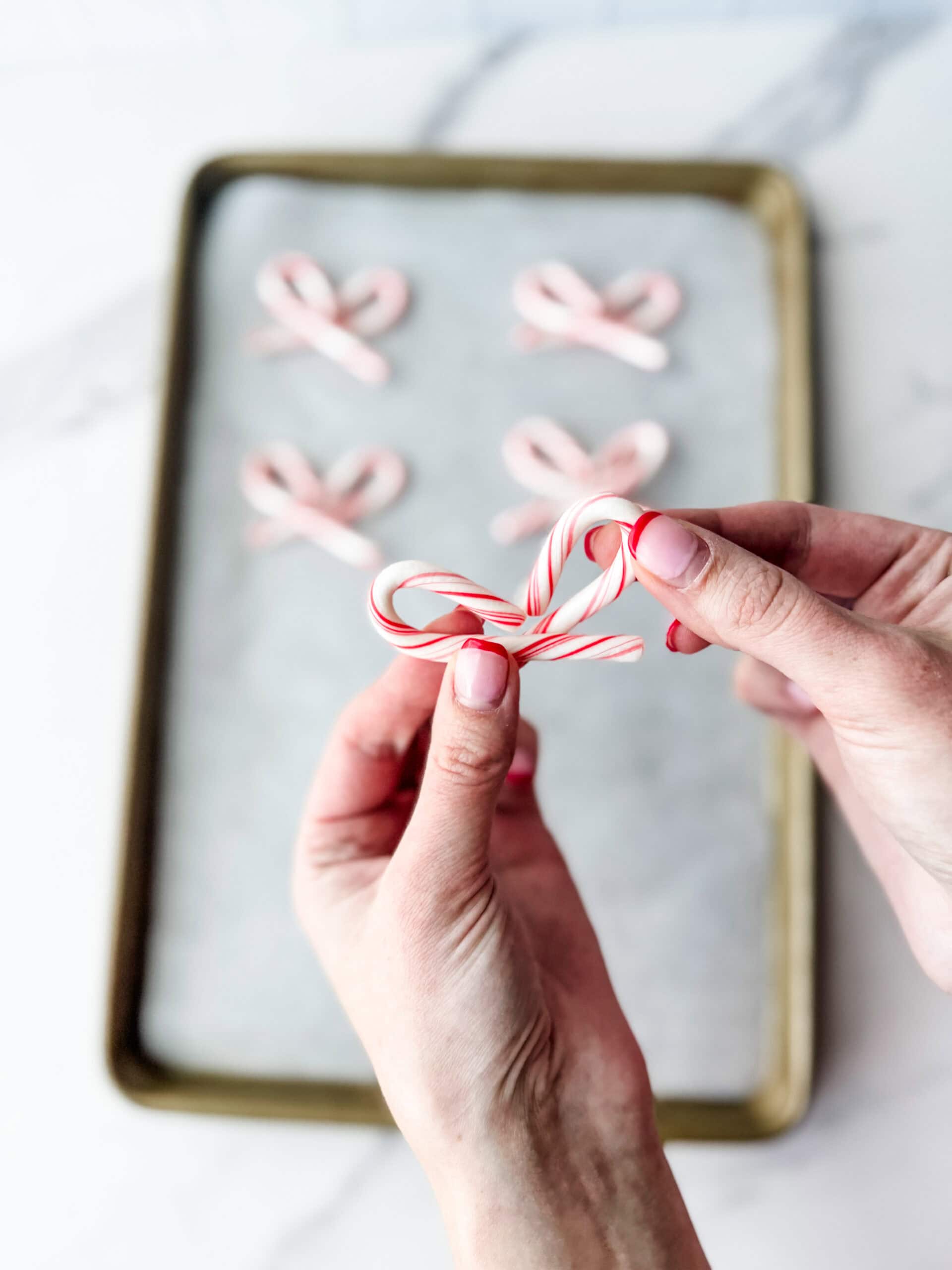 Place two candy canes on your baking sheet and arrange them into a bow shape by crossing the ends at the bottom. Break off the curved “hook” section of another candy cane and place that small piece in the center to create the “bow tie.”