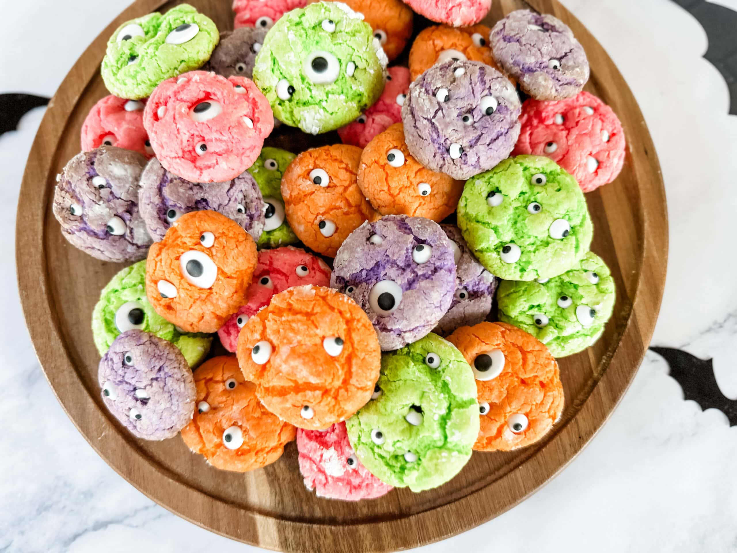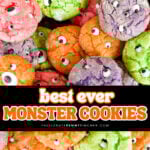 If you’re fixing up some fun for your kiddos this spooky season, these colorful monster cookies are sure to be a HIT! Not only are they cute with little eyeballs (my kids LOVE that touch) and fun monster-y colors, they are delicious, too! This recipe gives the gooiest, softest cookie ever – we just love it!