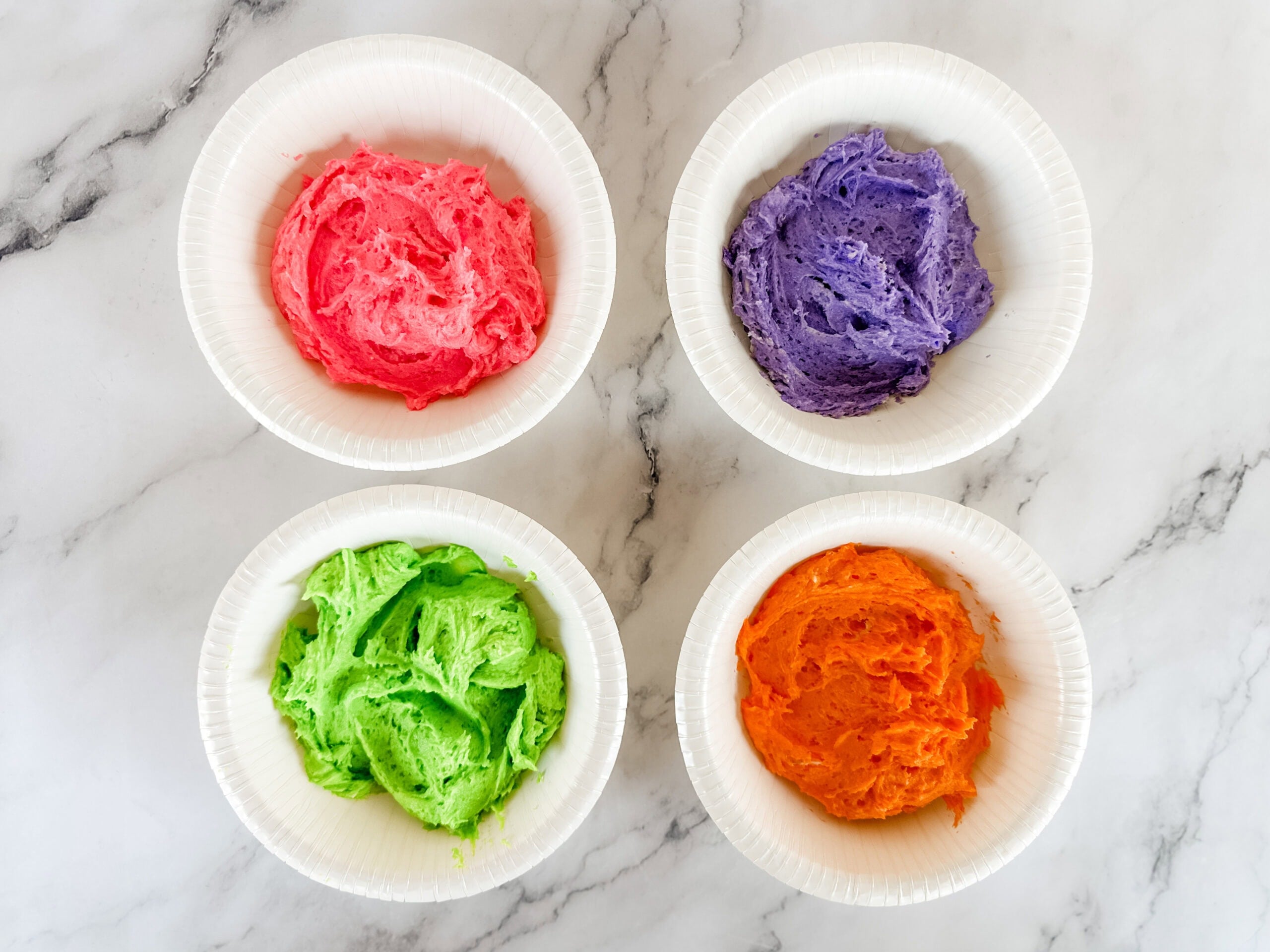 Divide the batter into however many bowls you have a color for. When you add the food coloring, be a little generous but also remember you can add more! The darker the color, the more vibrant the cookie will turn out.