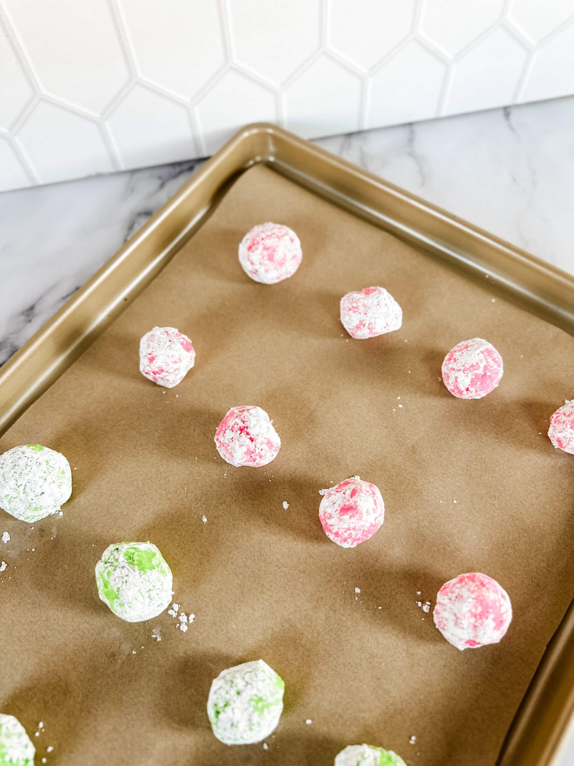 Preheat your oven to 350°. Once the dough is chilled, take out one color at a time and roll into about 1″ rounds. Roll these in the powdered sugar to coat and place on a baking sheet lined with a silicone mat or parchment paper. (Don’t use cooking spray on a baking sheet as this will discolor the bottom of the cookies too much).