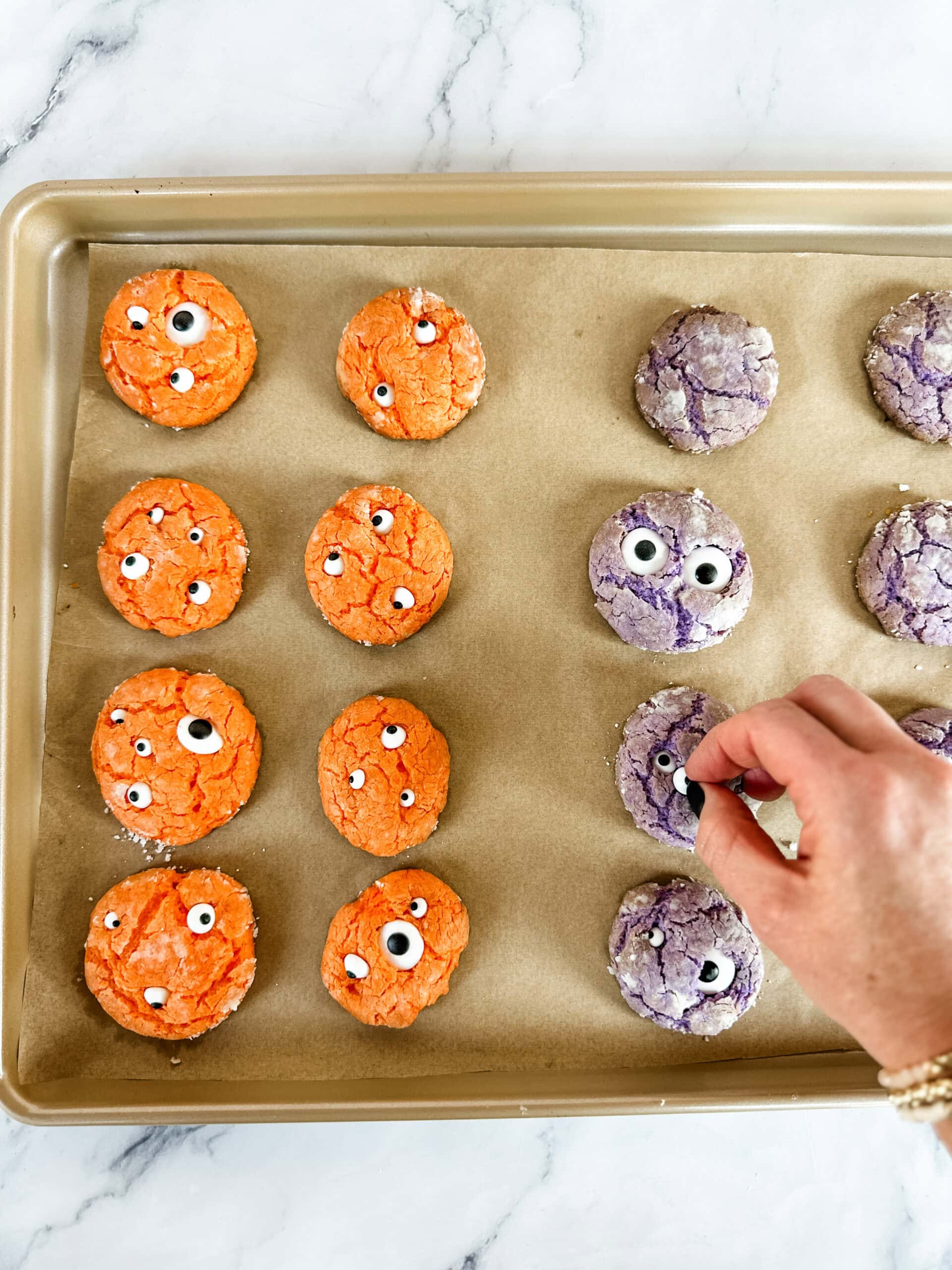 Now’s the fun part – adding the candy eyeballs! Add the eyes right after the cookies come out of the oven. The tops will be nice and warm and easy to place eyeballs in wherever you’d like – they’re supposed to be a bit wonky!