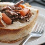 I made this for Sunday dinner. I browned the meat with a little bacon grease in a cast iron skillet. I omitted the flour. I put Garlic paste in the meat instead of onion. I added diced carrots, pearl onions, and quartered potatoes to the broth. The meat fell apart when it was done. No need to slice it. I didn’t have bread bowls. Served in a regular bowl and piece of bread. Great recipe! I will be making this again!