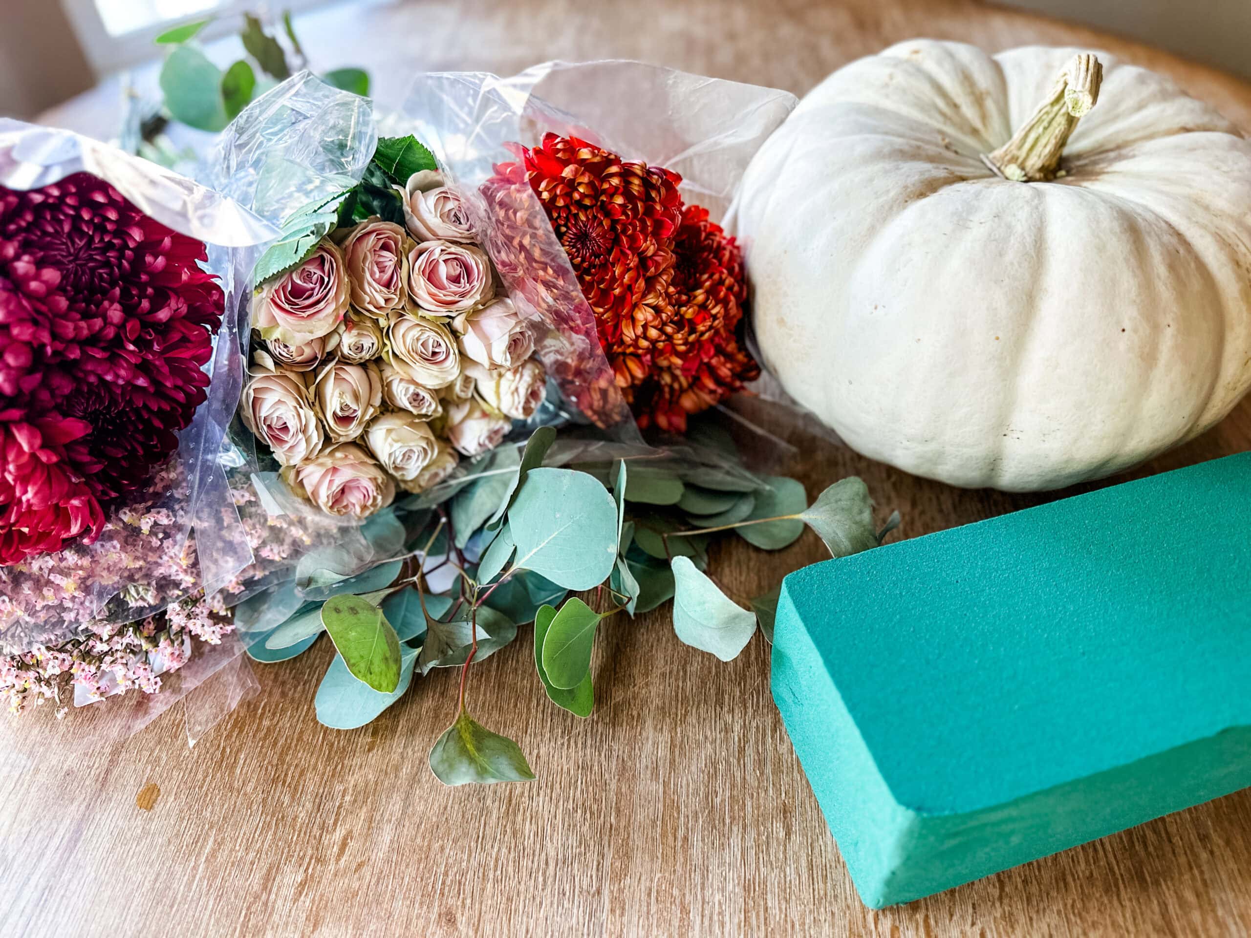 - Floral foam OR a bowl/vase – I originally grabbed wet floral foam (you soak it in water and stick the flowers into it) but decided mid-project to use a shallow Tupperware container that fit perfect inside my pumpkin.