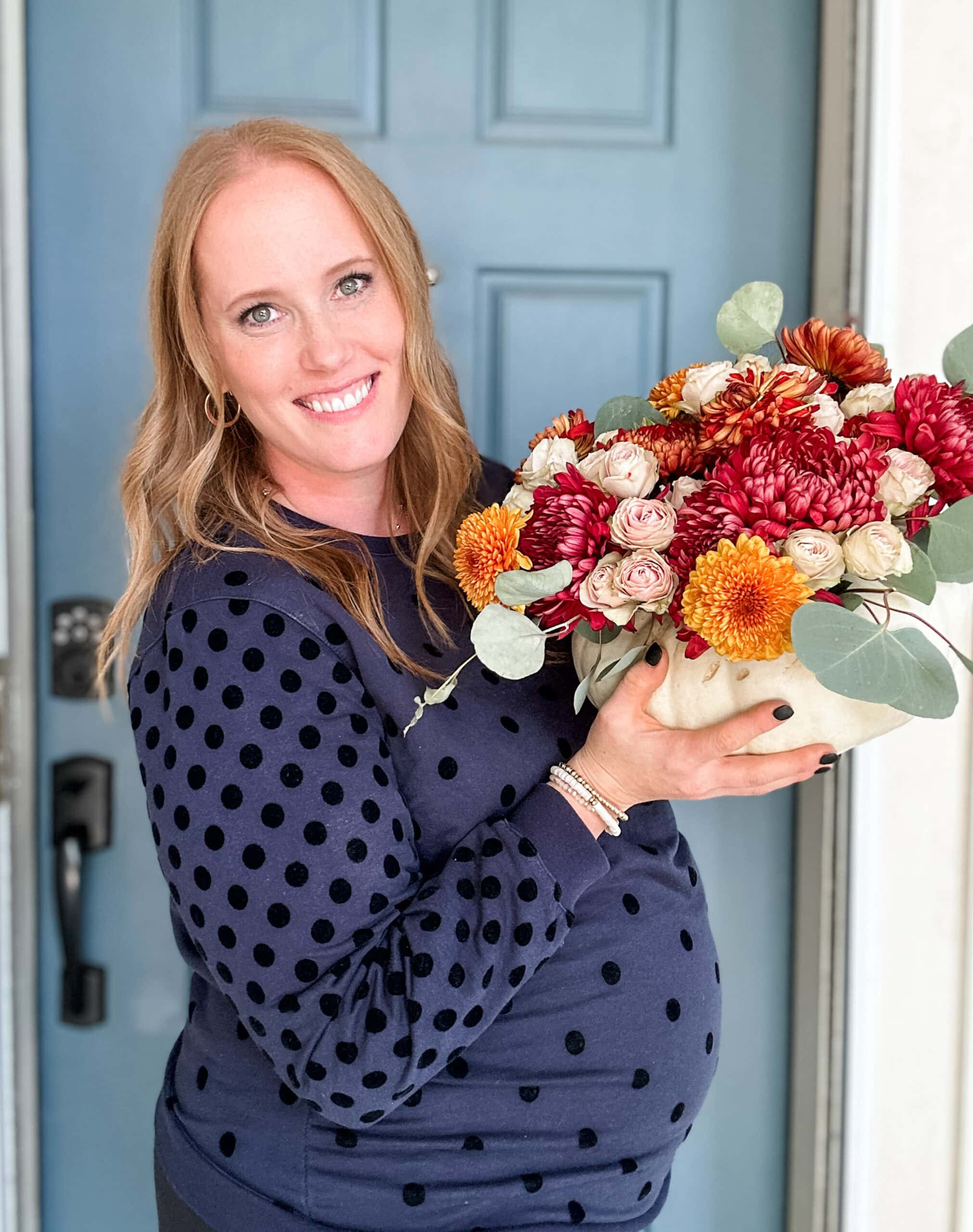 Hey there – Laura, here! If you’re looking for a way to really WOW your guests this Thanksgiving or add some fresh flowers to your fall decor, I cannot recommend this DIY pumpkin flower arrangement enough!