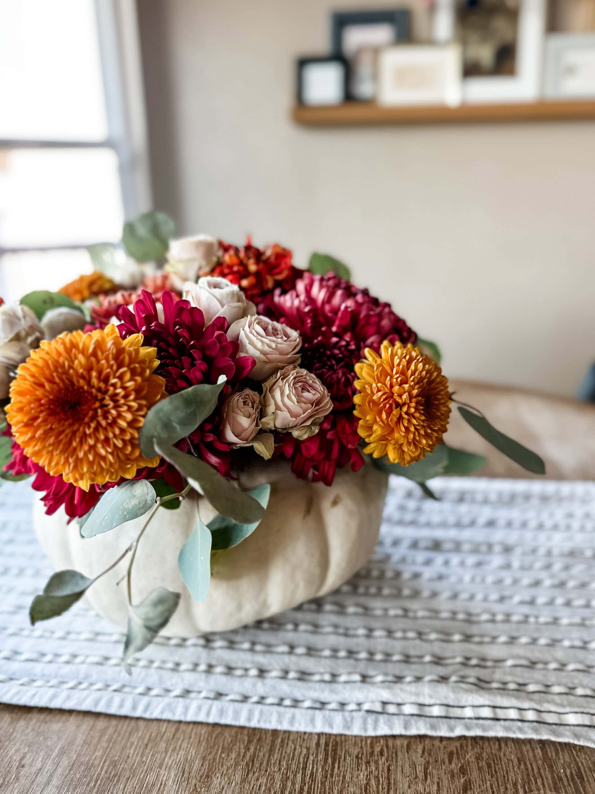 This DIY pumpkin flower arrangement is SO easy to make and is a stunning centerpiece for your fall and Thanksgiving table!