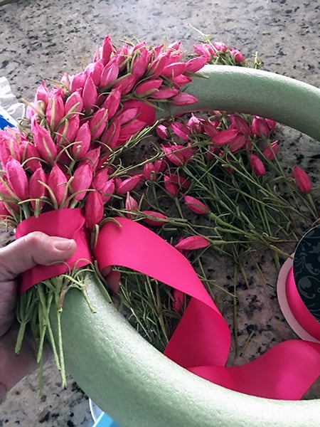 Just wrap, and wrap and wrap the ribbon around your wreath embroidery hoop form and tuck tulips in before using your hot glue to secure the flower buds.