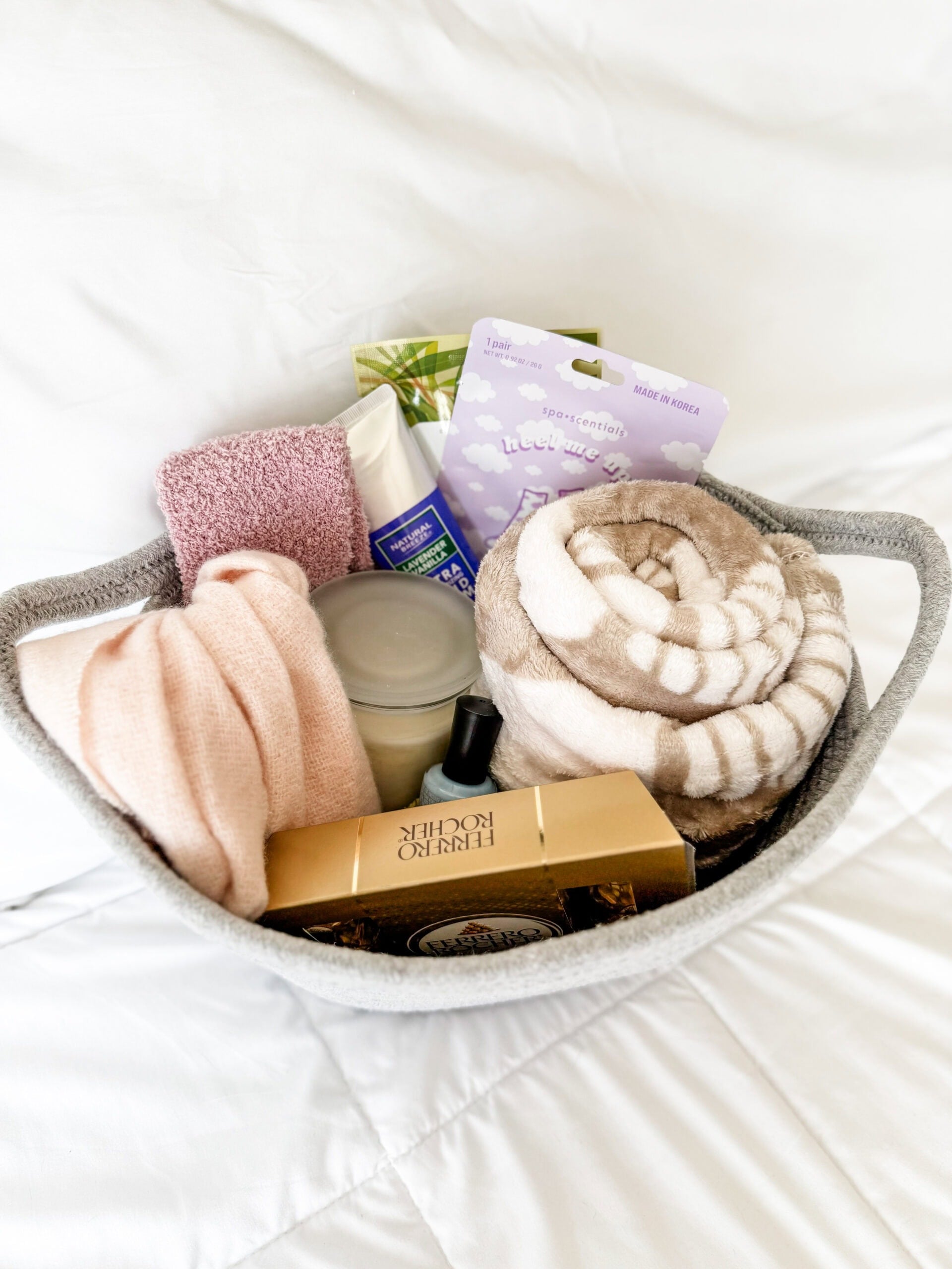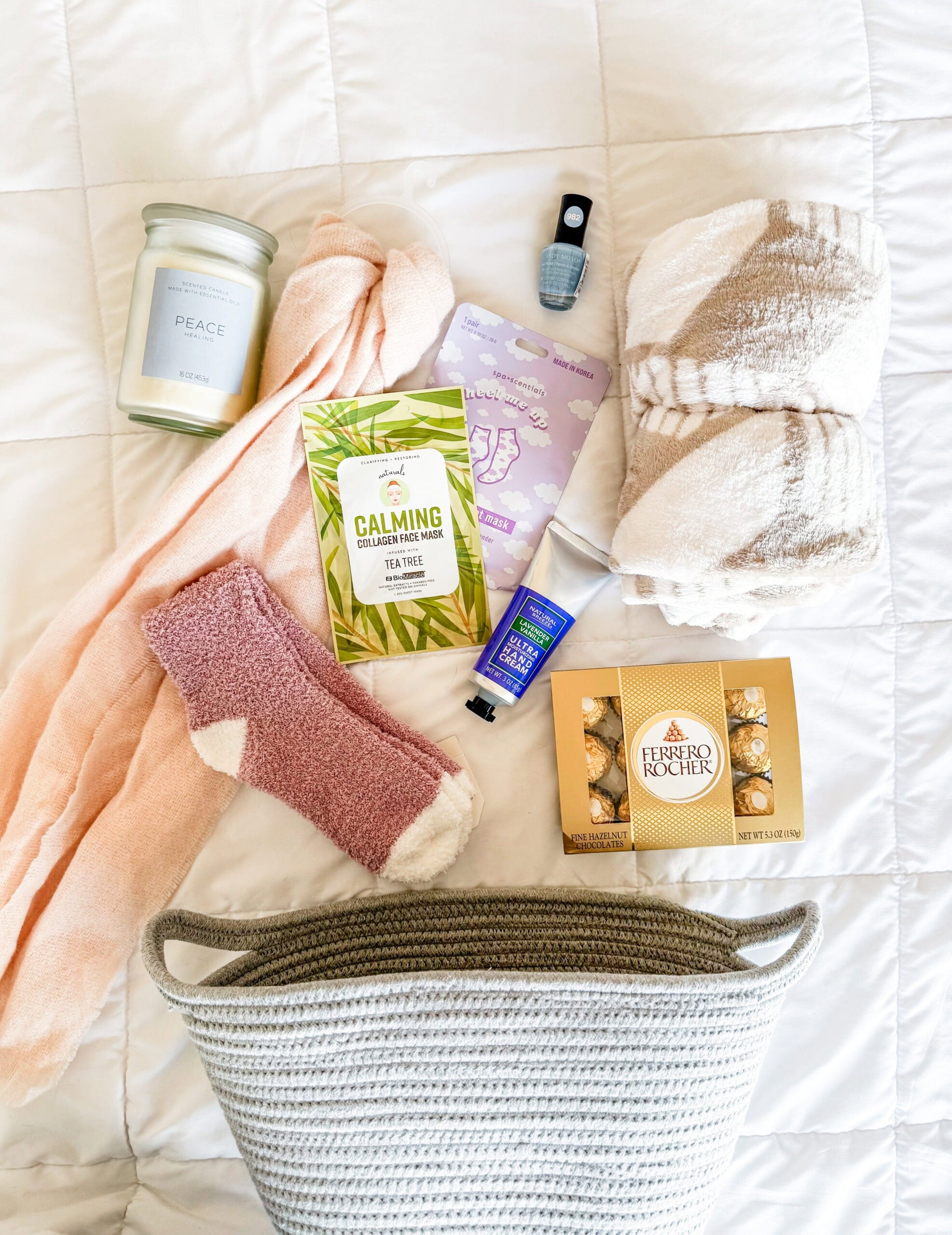 Since winter is the perfect time for a little extra self-care, I also included nail polish, spa treatment masks, and nourishing hand cream. And of course, no cozy night in is complete without a little chocolate to enjoy!