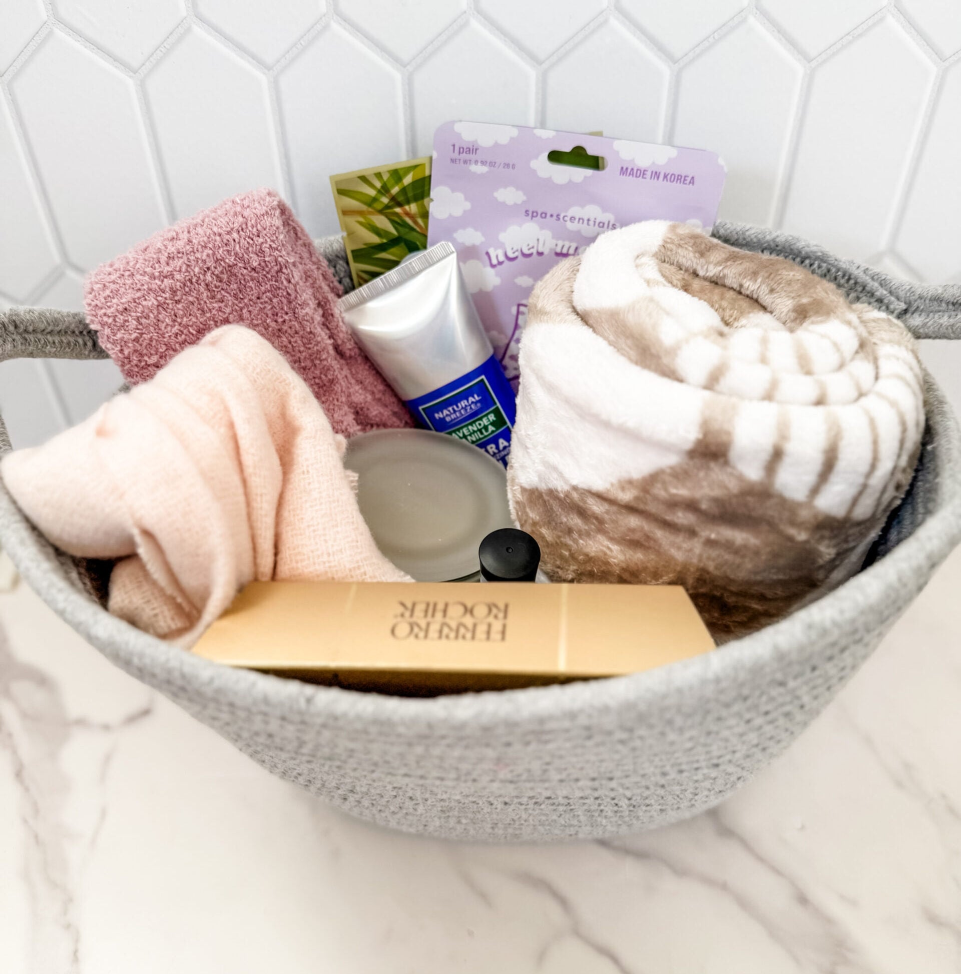 All you do is layer everything into your basket in a way that looks full and intentional. I like to place the blanket or filler item first, then stand taller items toward the back and tuck smaller goodies in the front. Fluff it up, adjust as needed, and you’re done. No special skills required, just a little arranging and creativity. You could easily add a bow or a thoughtful card to tie it together as well!