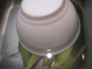 - Cover with water, and use some kind of weight to keep corn submersed under water (we used a heavy bowl).