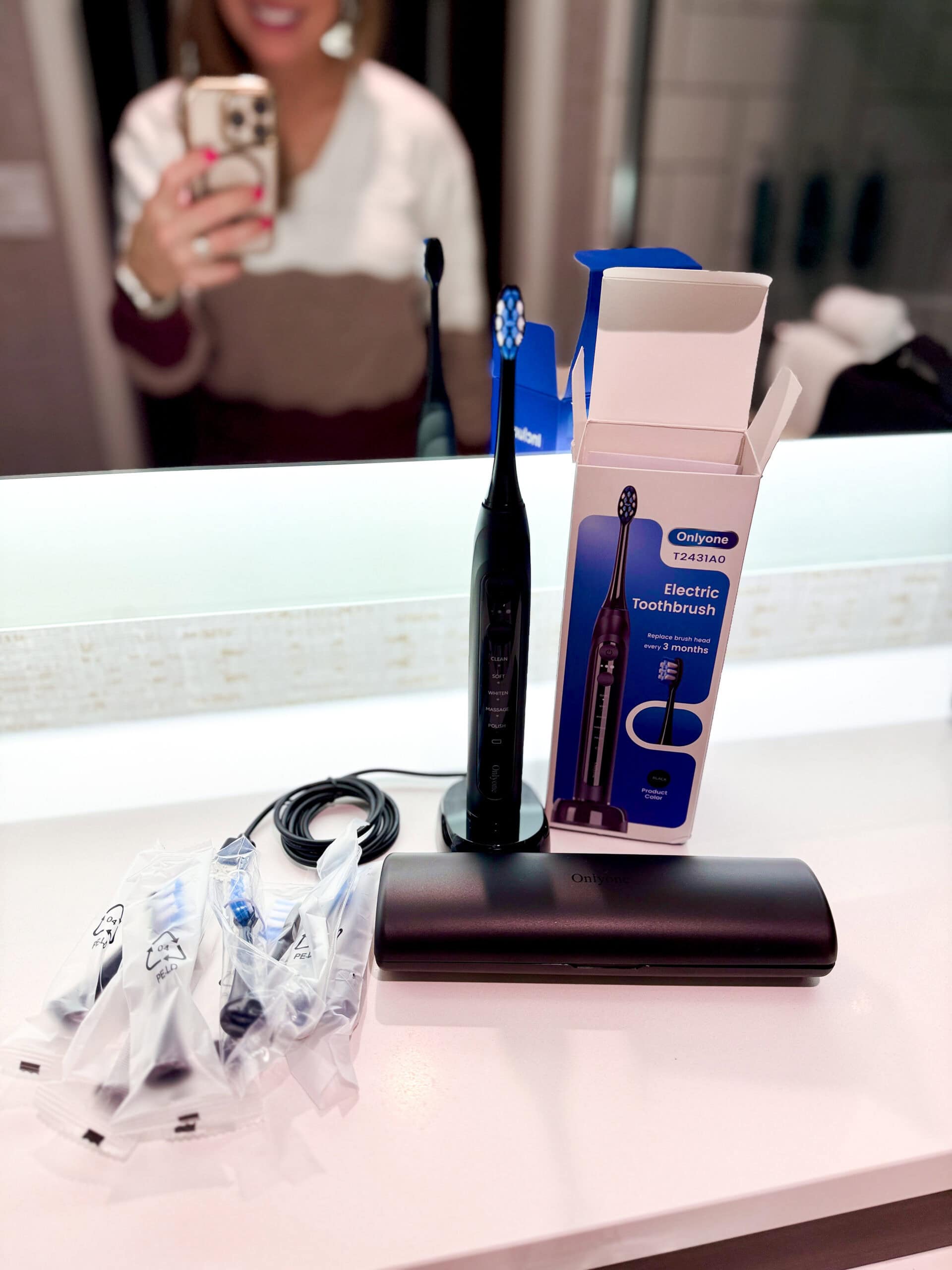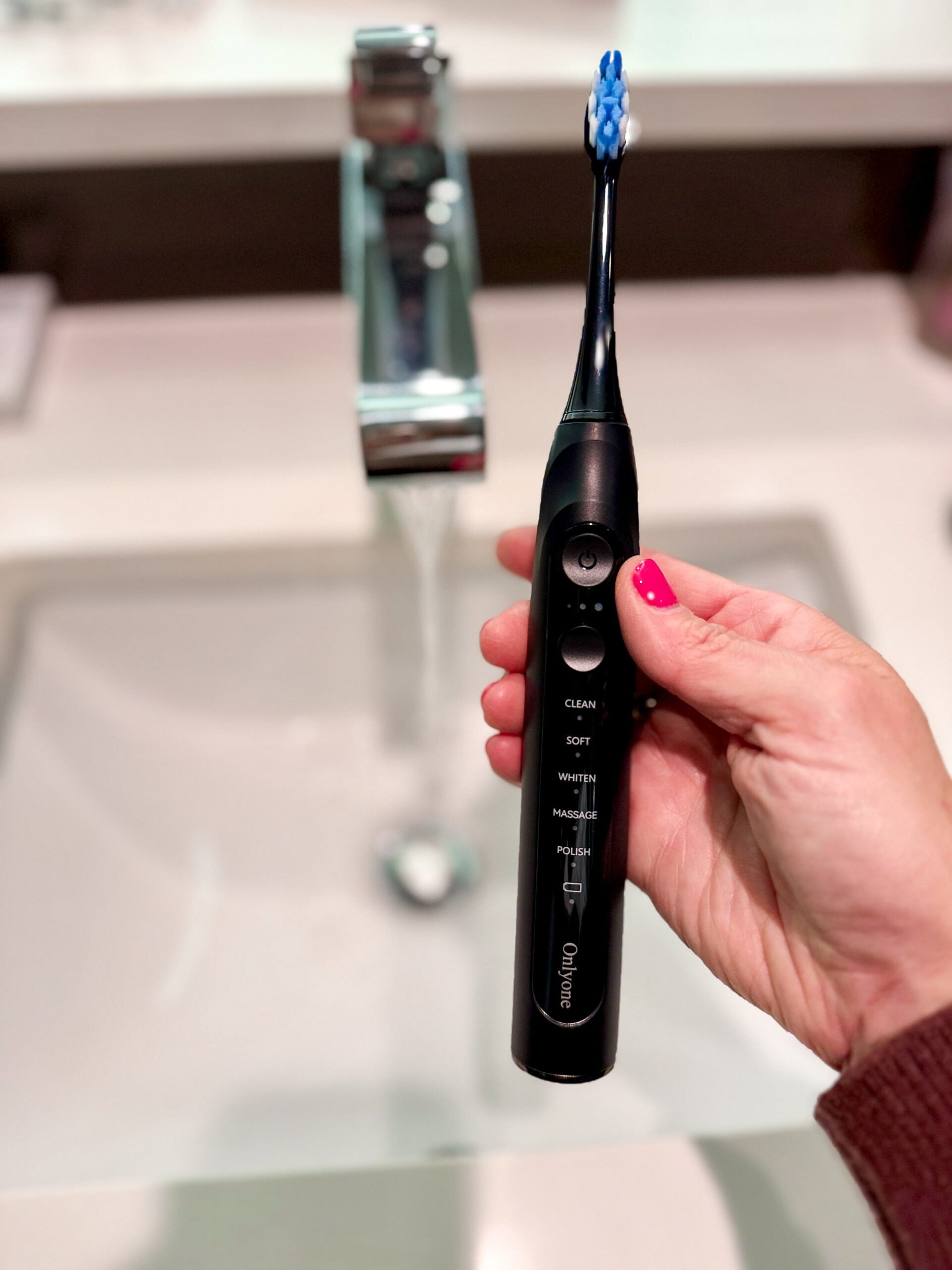 “Mary here! I went to the dentist recently and they suggested that I switch to a Sonic Electric Toothbrush and mentioned that the Oral-B brush head I’d been using was likely too harsh on my receding gums. SO I swapped to this brush and it’s been working great so far! It’s not as intense as I’m used to, but that’s a good thing for me. I like that it has five different modes and a timer so I know when to swap locations.”