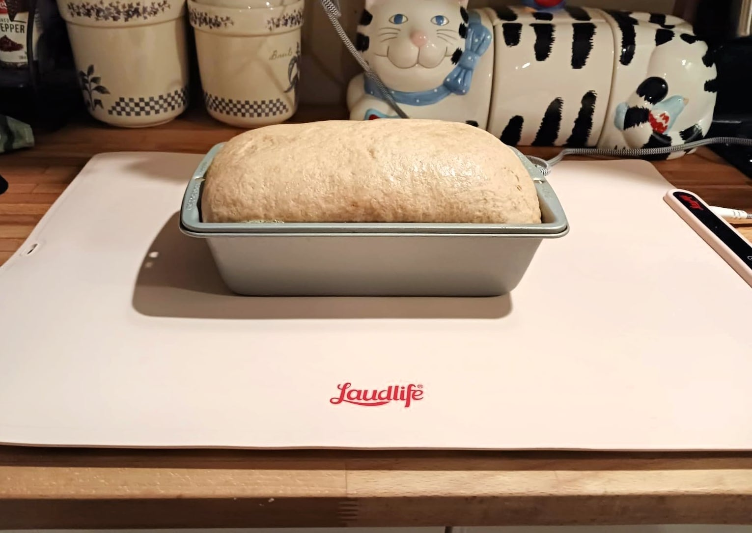 I was pretty skeptical about any use for this, but then I saw bread proving as one of the suggested uses and decided to order one and give it a try. Does it work? For yeast activation and bread proving, I say yes! I put pictures of my yeast when I first put it on, then after a 10 minute activation. It doubled as hoped. Then I put the picture of the dough immediately after kneading, then after a 30 minute rise on the mat at 154 degrees, or something close to that. In it’s oiled bowl with its towel. Rose beautifully. Then the bread loaf when first formed, and again after a 45 minute rise. As you can see, it did the job. I’ve a family member with dietary restrictions, so making specialized bread is a fact of life here. I’ve used this mat once. It only arrived earlier today. It’s already fast become one of my favorite things!
