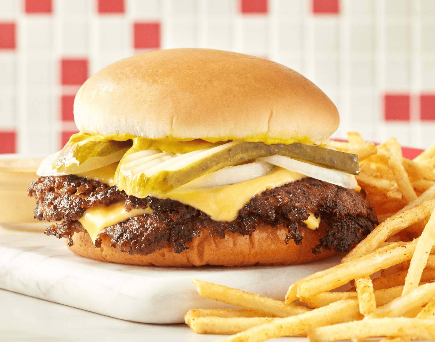 The Freddy’s Original Double features two juicy steakburger patties, two slices of cheese, mustard, onion slices, and pickle planks all served on a toasted bun — a fan favorite for a reason!