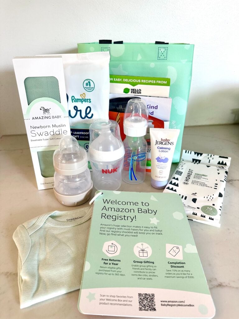 My friend’s Amazon Registry box came with a muslin burp cloth, a cute onesie, Huggies diaper samples, a bottle, WaterWipes, various samples, a TENA pad, various coupons, and Dreft detergent!