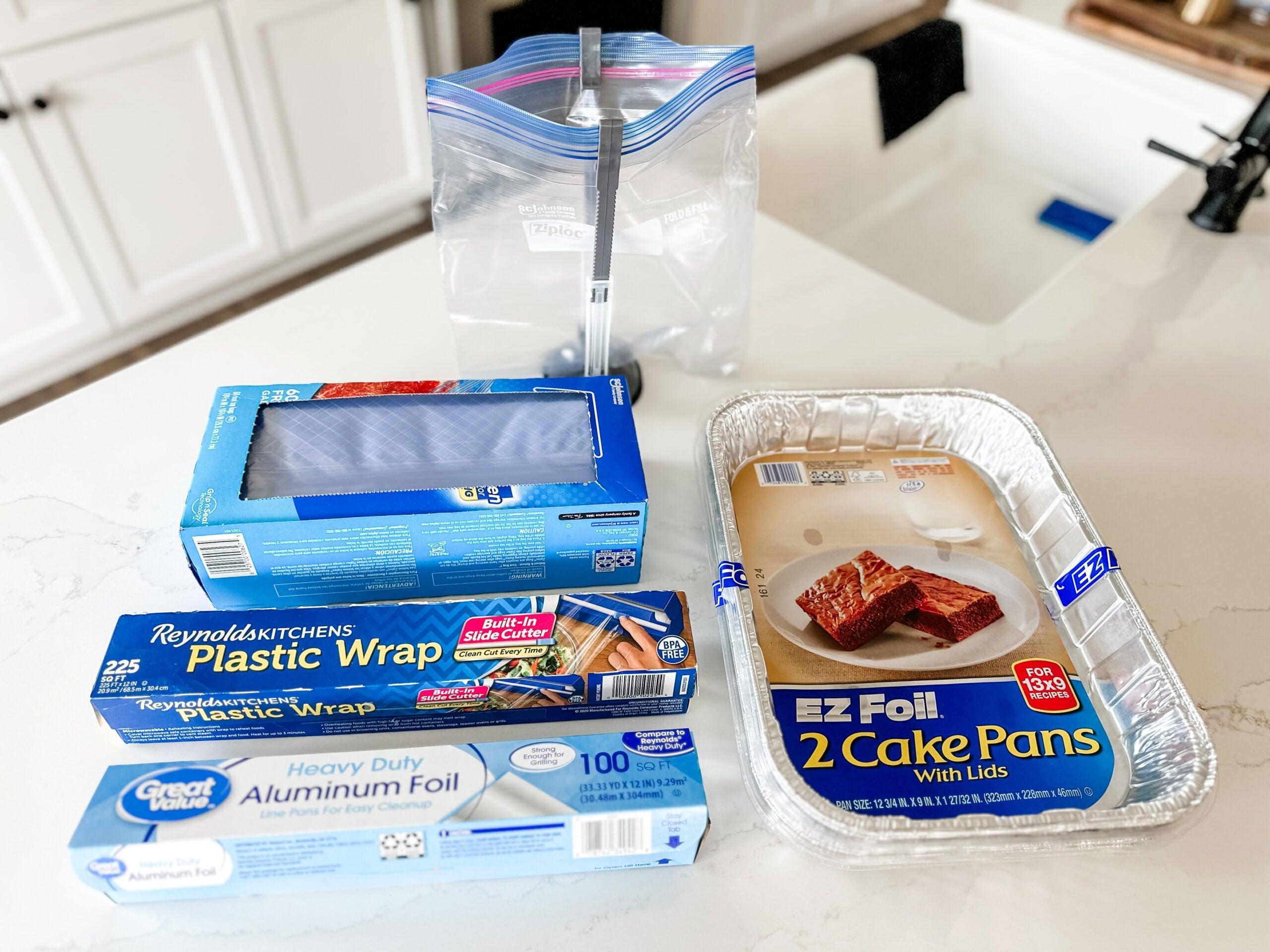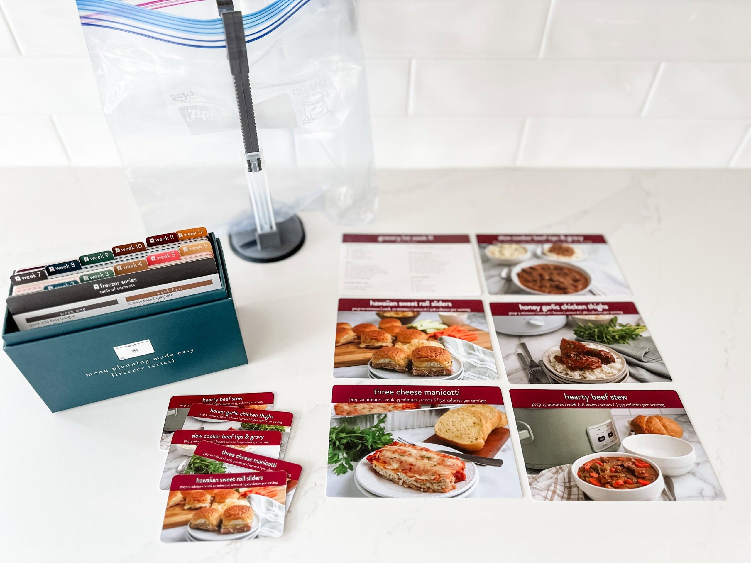 You can have another guest in charge of bringing Freezer Ziploc bags and disposable pans. The recipe card and grocery list will tell you how to store each meal so you know how much supplies to bring. You’ll use two Ziploc bags per meal to avoid freezer burn, spills, and have a space to keep the Recipe Insert Card visible and clean for day-of cooking instructions.