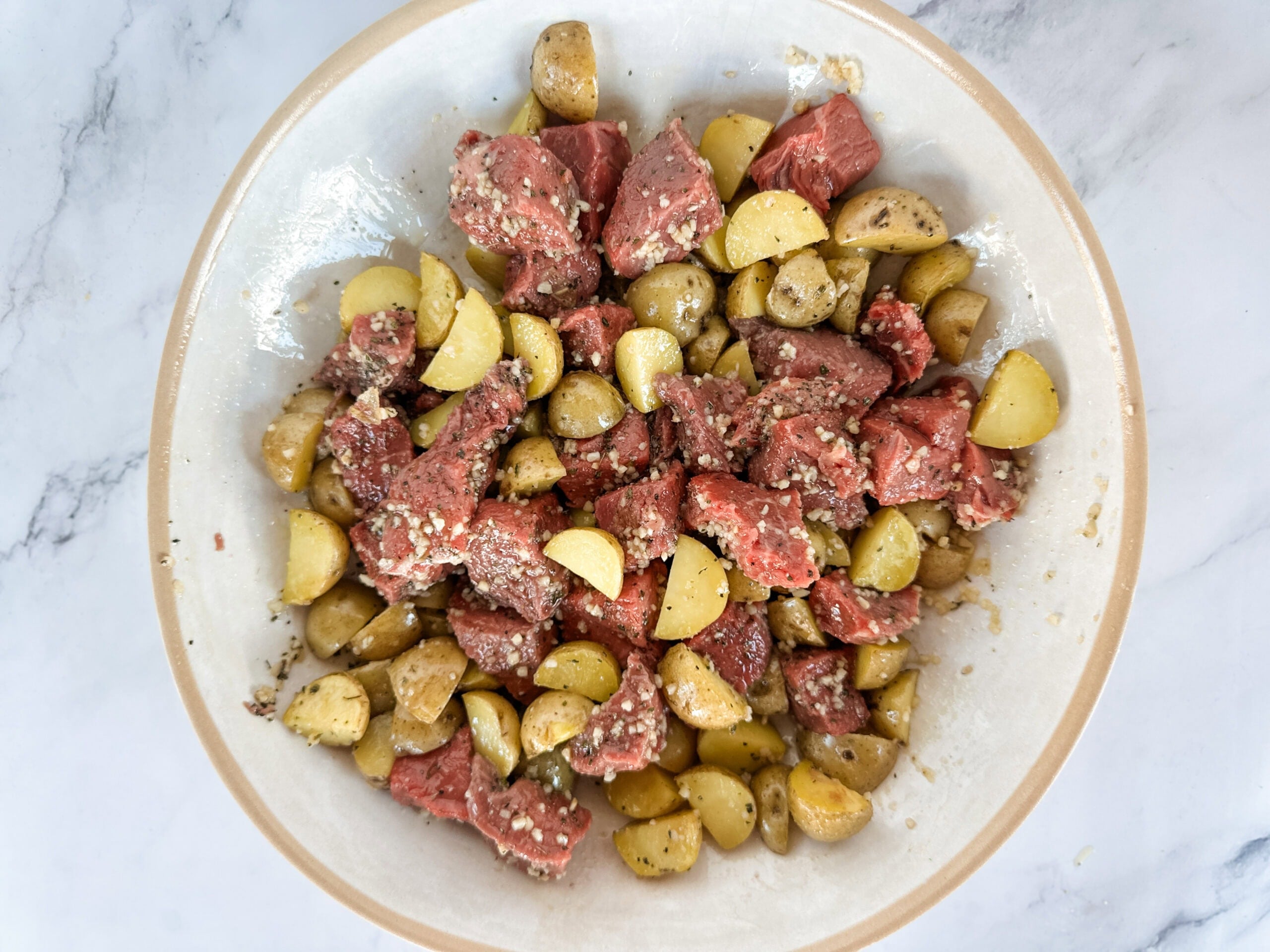 - In a large bowl, combine steak, potatoes, olive oil, garlic, onion powder, oregano, salt, and pepper; toss to combine.