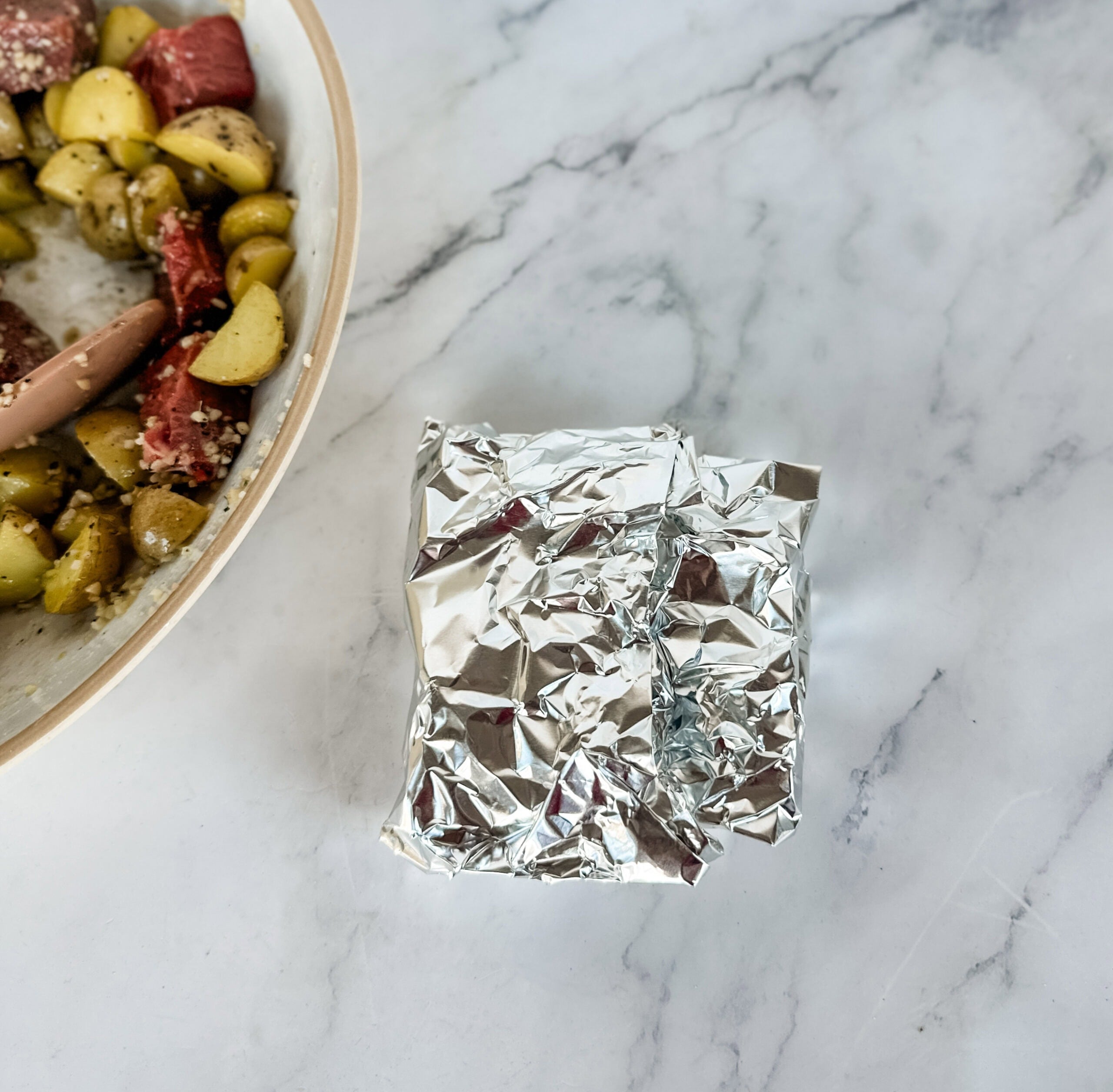 You’ll need six 12-inch squares of foil. Lay these out on your counter and divide the steak & potato mixture evenly between each piece.