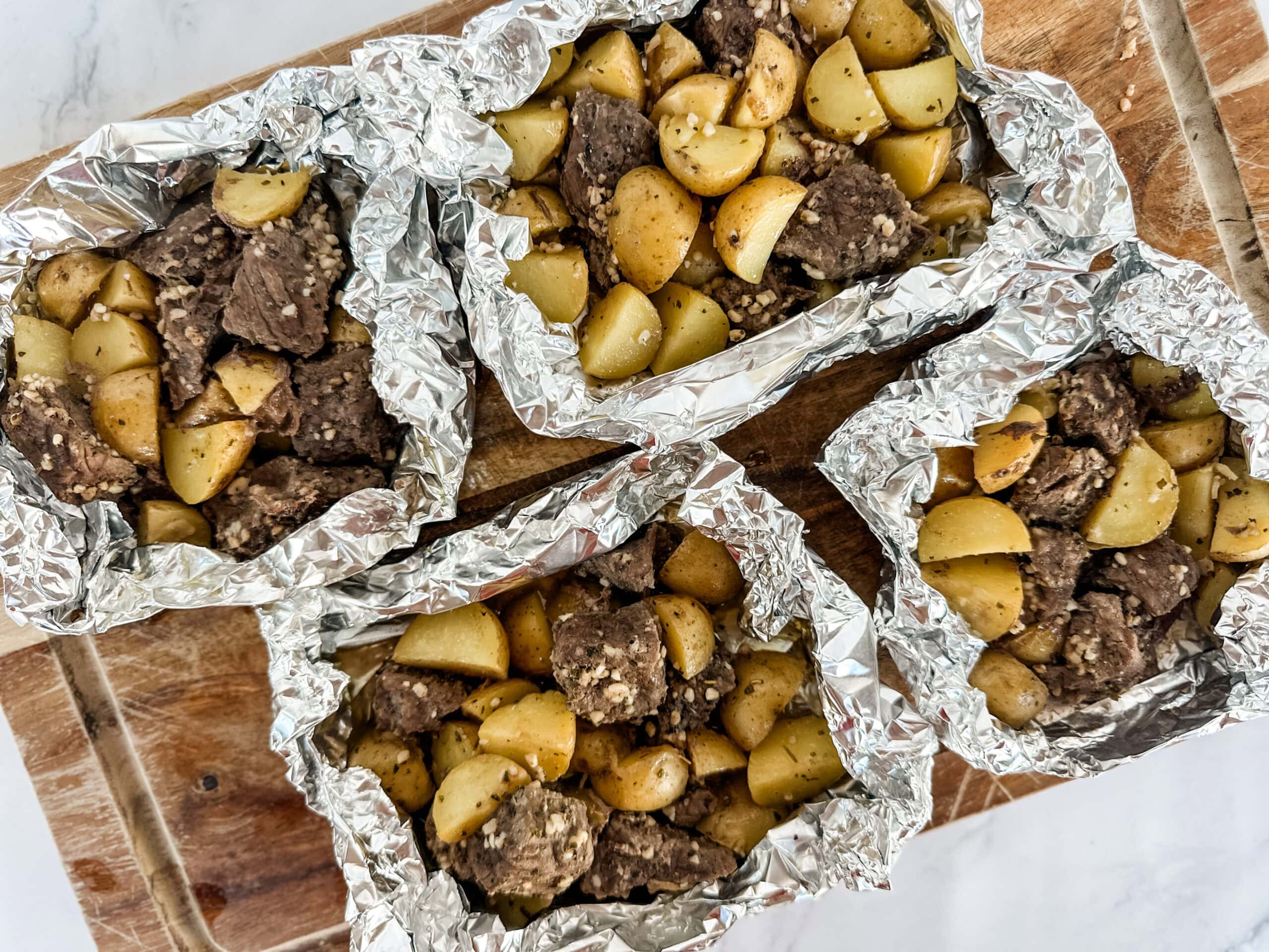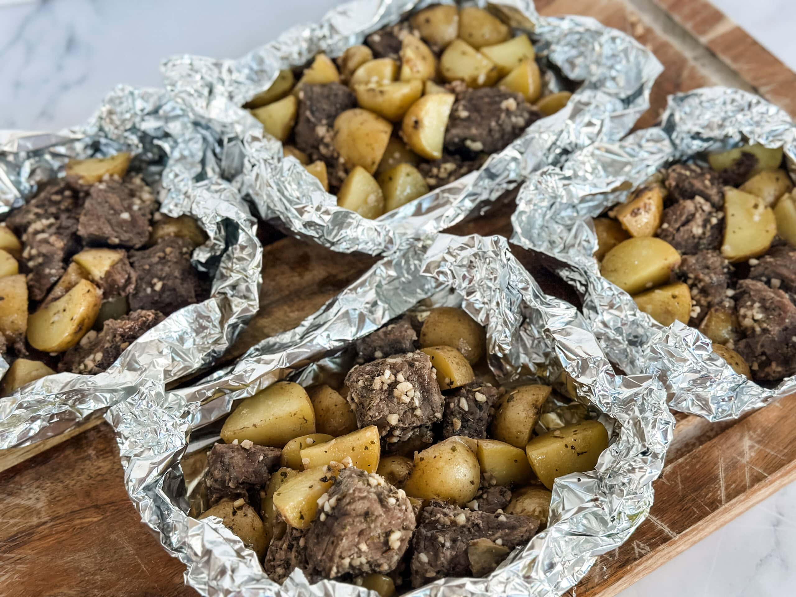 - Divide steak and potatoes between 6 (12x12-inch) sheets of foil, then wrap foil tightly around the contents to form foil packets.