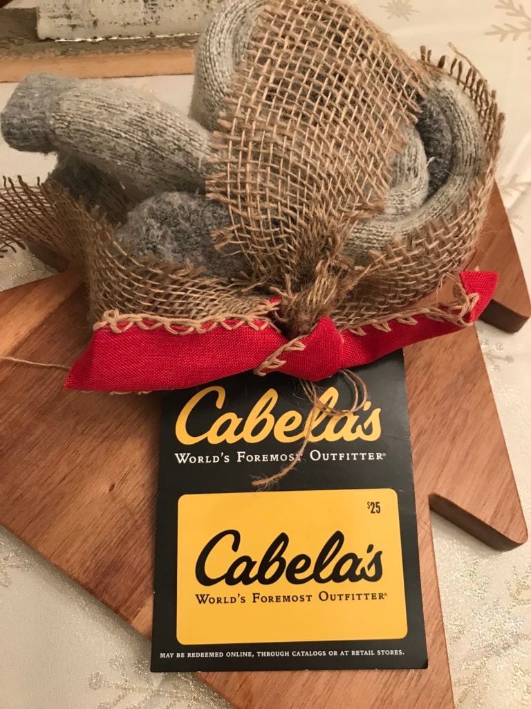 Use a pair of wool socks (or sport socks) and roll up a gift card for Home Depot, Lowes, Cabela’s, Dick’s Sporting Good, Academy Sports, Bass Pro, etc. (or tie it on). Especially in winter your hunter/fisherman/sport playing/carpenter/hard working man is sure to enjoy wearing them while getting some good use out of the gift card!