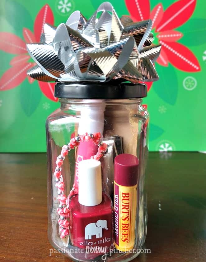 Use a clear bag or mason jar and add a small lotion, nail polish and nail file along with the gift card or gift certificate.