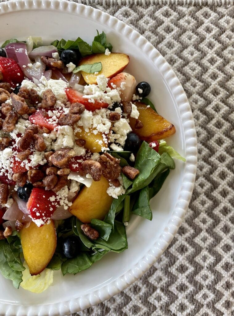 Because I love a yummy fruity salad (I make them at least a few days a week for lunch), I almost always keep strawberries, blueberries and pecans on hand. So I added every bit of that yumminess, and created a happy fresh rainbow-color-salad right at home.