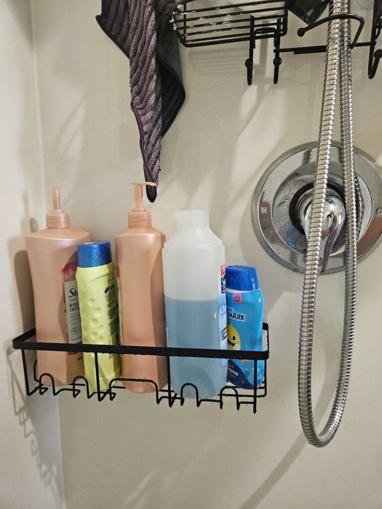PPP Team Member Jamie loves this organizer – she said it holds really heavy bottles, all their loofahs hang from the hooks, and it frees up the rim of her tub!