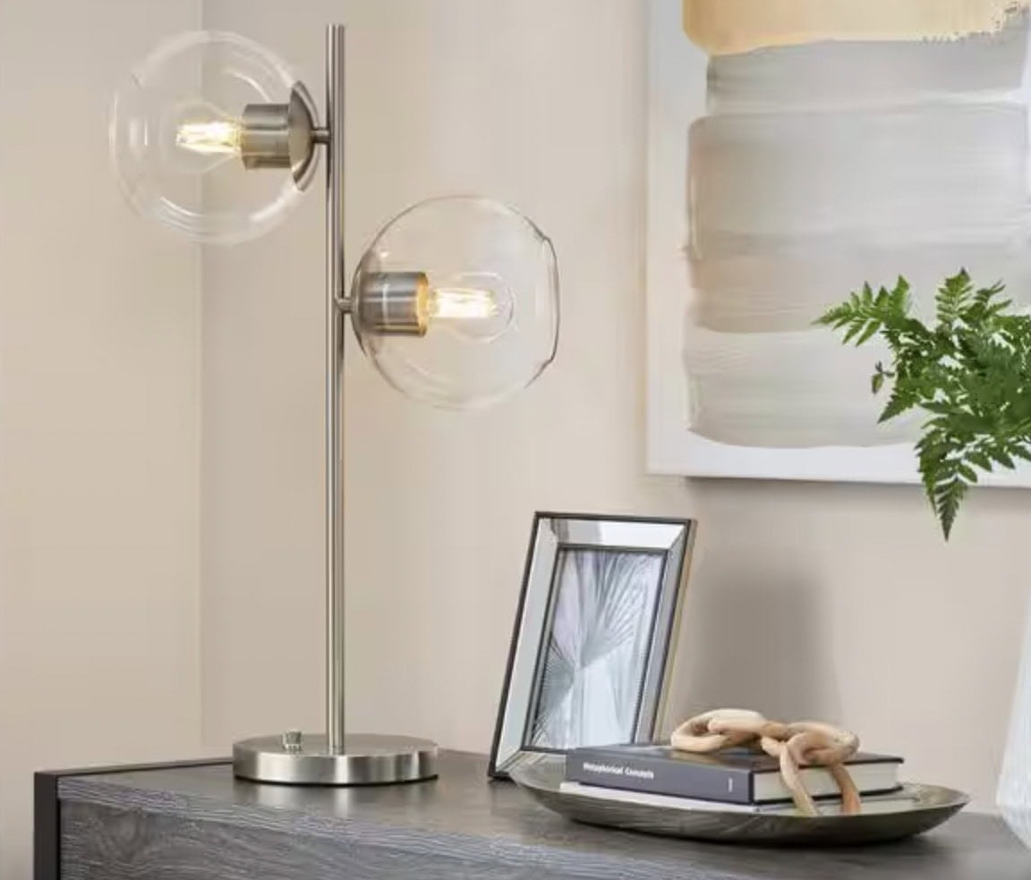 Vista Heights 24.5 in. Brushed Nickel 2-Light Standard Table Lamp With Glass Globe Shade – $11.36 (Reg. $46)