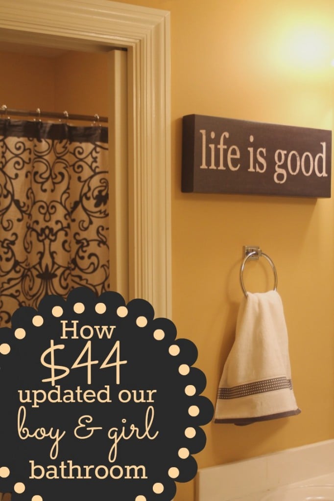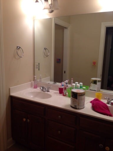 I’ve been putting off updating my kids bathroom now for a mere eight years (I know ~ crazy!) because I just didn’t know what to do with it. Because my three kids (two girls and a boy) share the bathroom, deciding on a “theme” has been difficult, so I just let it go (yucky builder paint and all) for entirely too long.