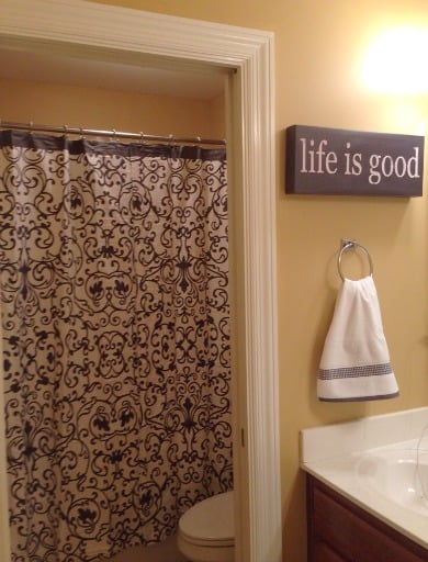 Finally though I decided to just use the paint that I already had on hand (it’s the paint that’s in the main areas of our home), and see what we could do with it. I took my kids to TJMaxx (note that I did not go to Target where they would inevitably fight over princess, camo colors, or zebra prints), and let them pick out the shower curtain.
