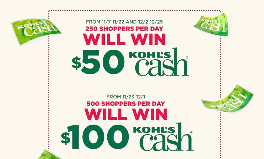 The first 100 customers who stop by Kohl’s this weekend (12/20 & 12/21) will score a FREE mystery Kohl’s Cash voucher worth somewhere between $5 and $100, no purchase necessary! (Limit 1 per household).