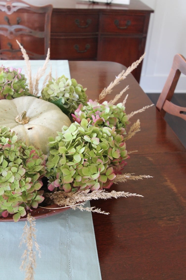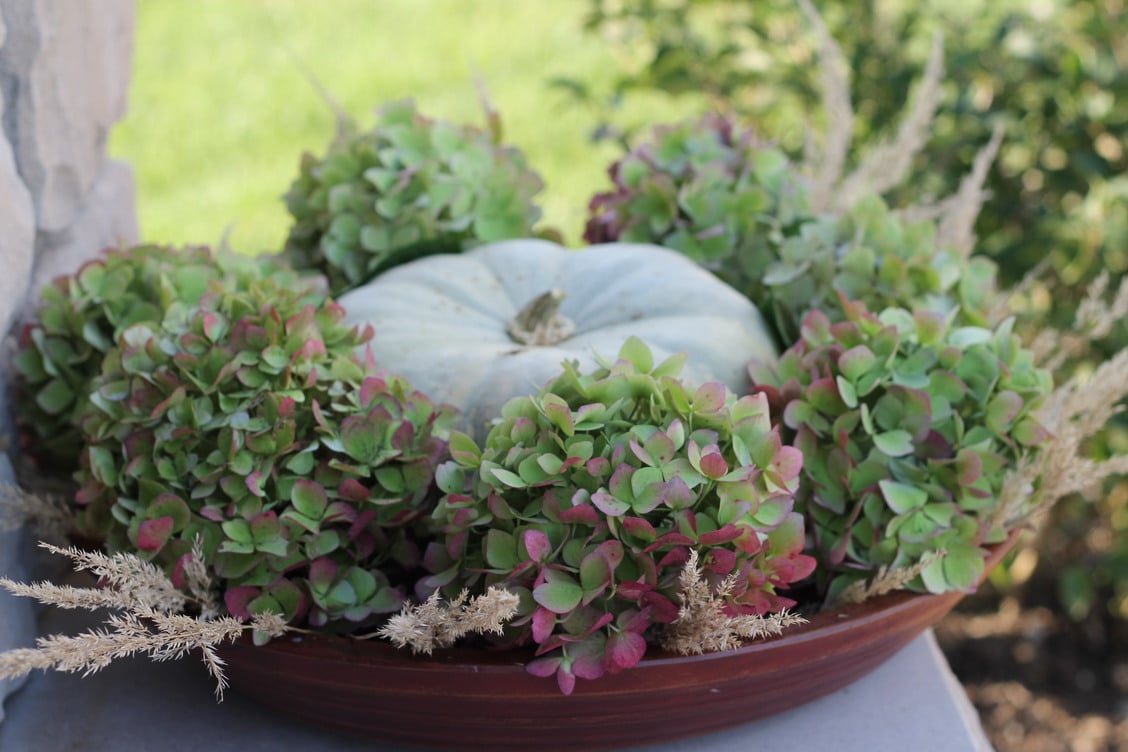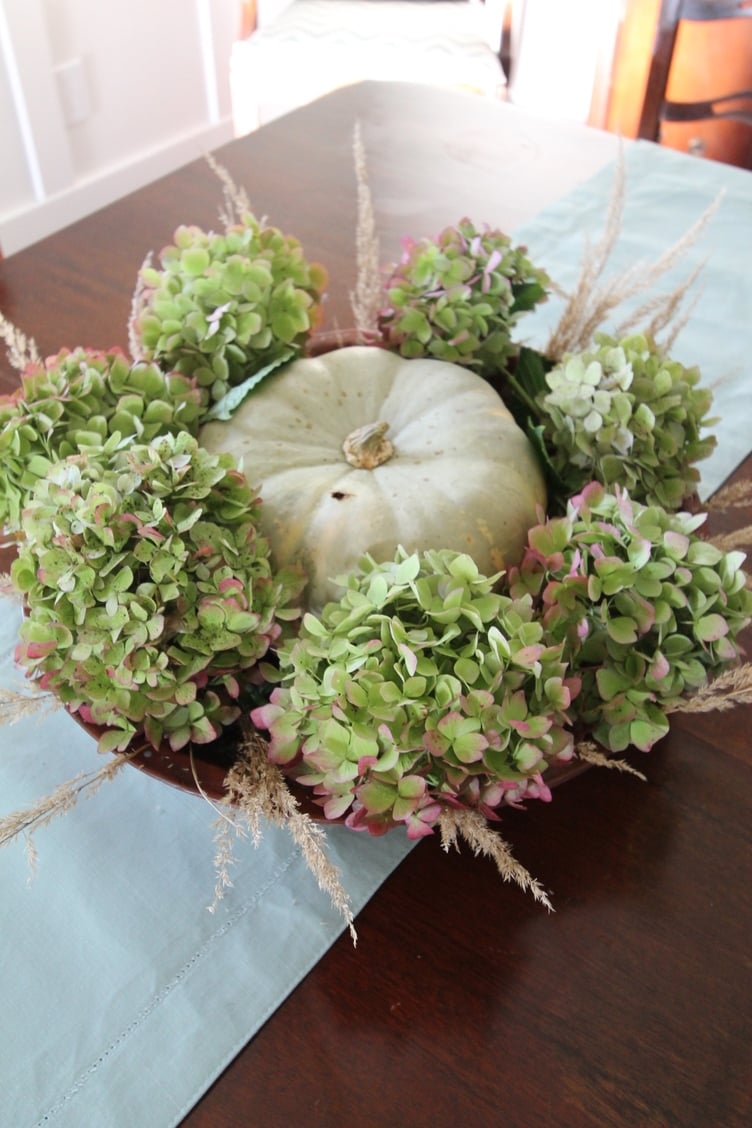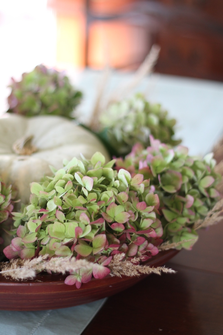 This little bunch of hydrangeas mixed with a pumpkin and some weird funky grass are just perfect for me.