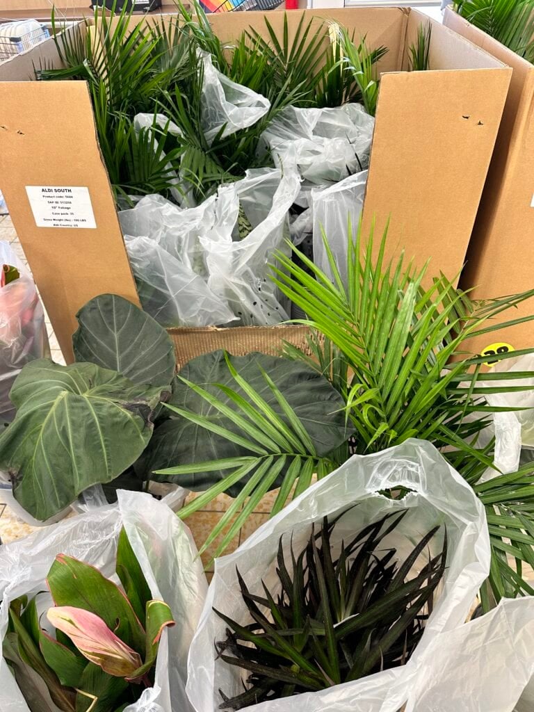One of our FAVORITE ways to save at Aldi is to scoop up any plants they have on sale for the week. Most recently we saw LARGE potted Fiddle Leaf Figs, Snake Plants and Tropical Plants for only $9.99! During the winter Aldi offers lots of indoor plants and Poinsettias. During the Summer you can find Mums for $3.99 (the Aldi Mums Sale is legendary!) or hanging baskets for $6.99.