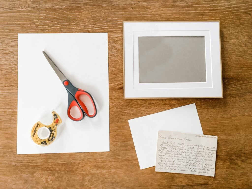I cut the paper to the size of each frame and centered the recipe on it. I used one small piece of double-sided tape to attach the recipe card to the paper. I would recommend the least amount of tape possible to avoid damaging the card if you decide to remove it later.