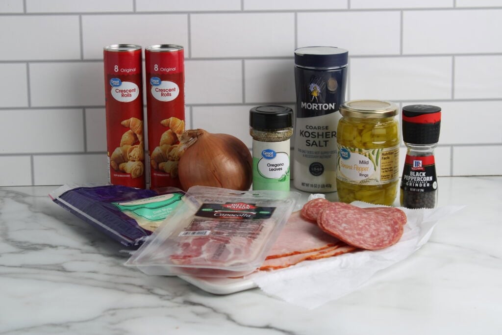 - Layer cheese, ham, capicola, salami, onion, and peppers on top of dough. Season with desired amount of salt, pepper, and dried oregano.