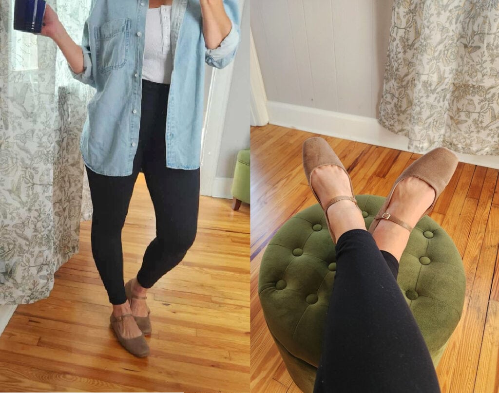 Flats are IN this Fall – and we are loving these Mary Jane Suede Ballet Flats – so cute and comfortable! They look great peeking out from under your flare jeans – or with leggings – simple and sweet! This outfit is a go-to for me at the office:
