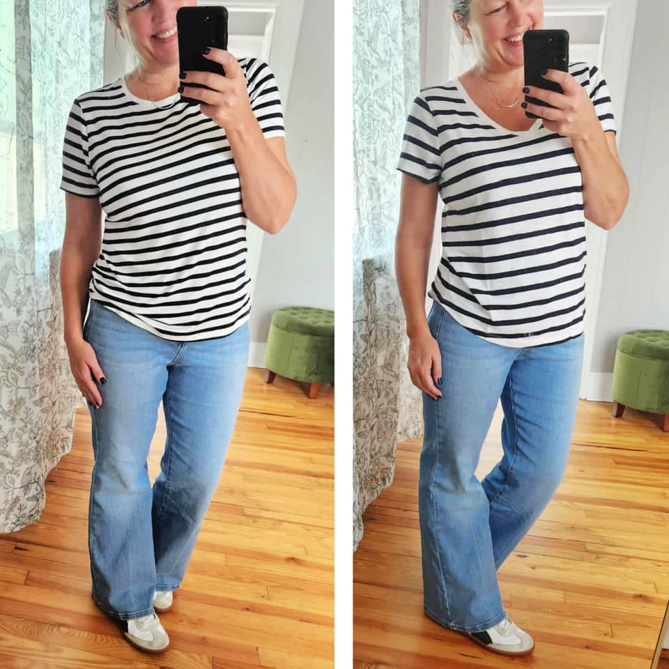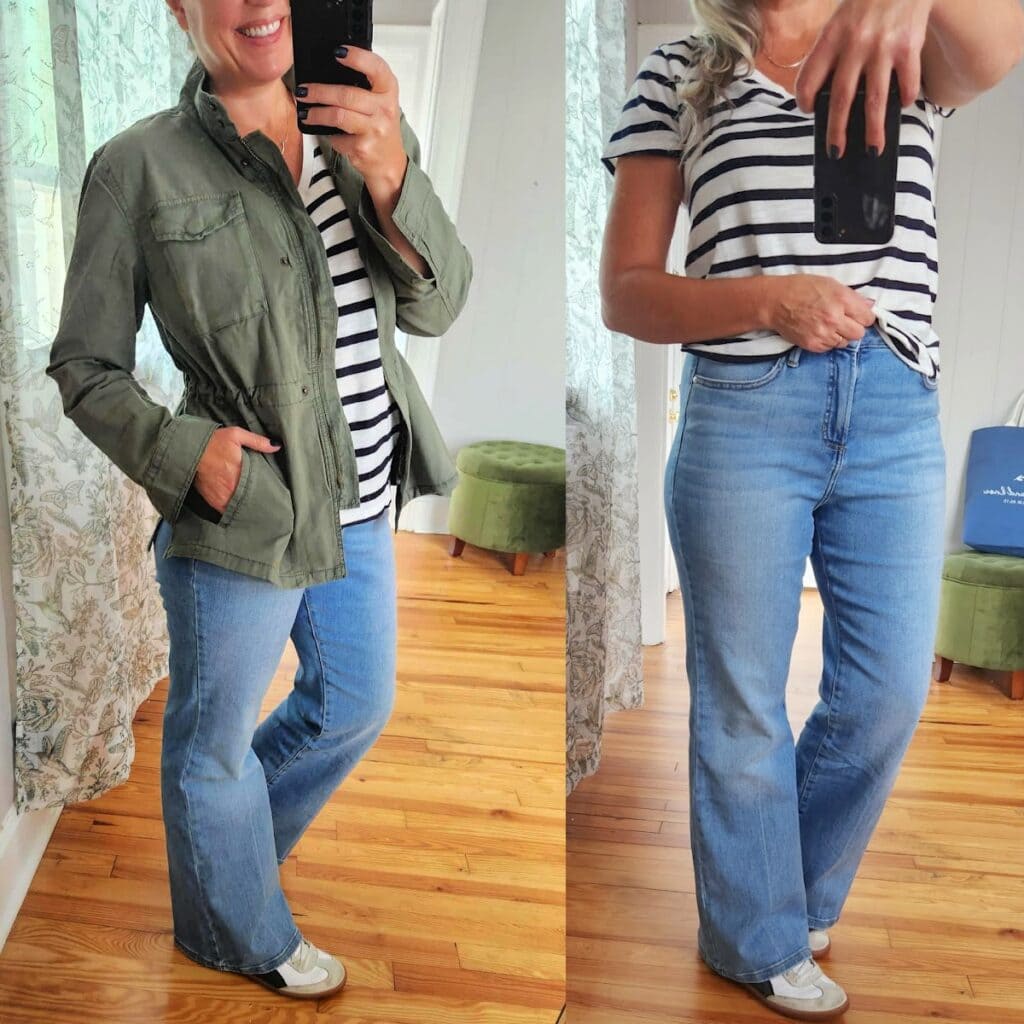 A black and white striped tee is perfect for layering under a utility jacket, cardigan or denim jacket – here are my two Kohl’s favorites: