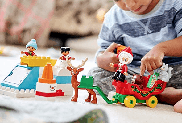 - Includes 3 LEGO DUPLO figures: Santa and 2 children, plus 2 animal figures: a reindeer and a squirrel.